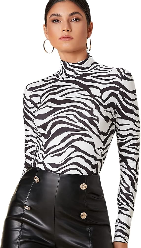 Milumia Women's High Neck Zebra Print Pullovers Long Sleeve Top
