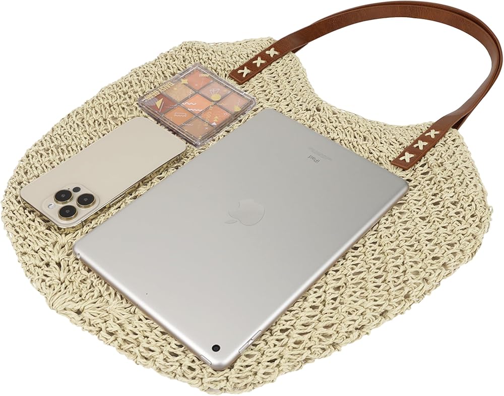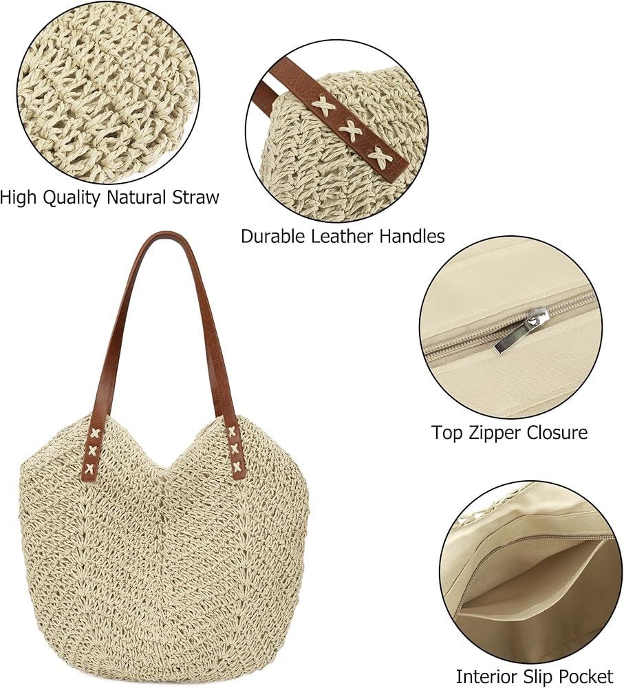 Leather Handles: Securely sewn into the body, the faux leather handles add a touch of luxury and styles to the classic natural straw bag