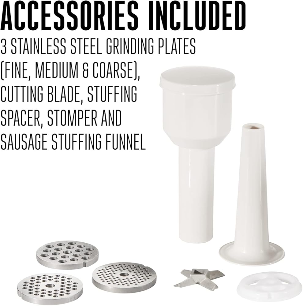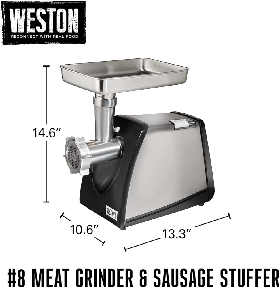 With the Weston #5 electric meat grinder & Sausage stuffer you can grind meat to perfection for fresh burgers, Sausage, meatloaf and more. This compact machine is great for at home use, Grinding up to 2 lbs per minute. There is a Reverse function that helps prevent jamming. Accessories conveniently store inside the stomper.