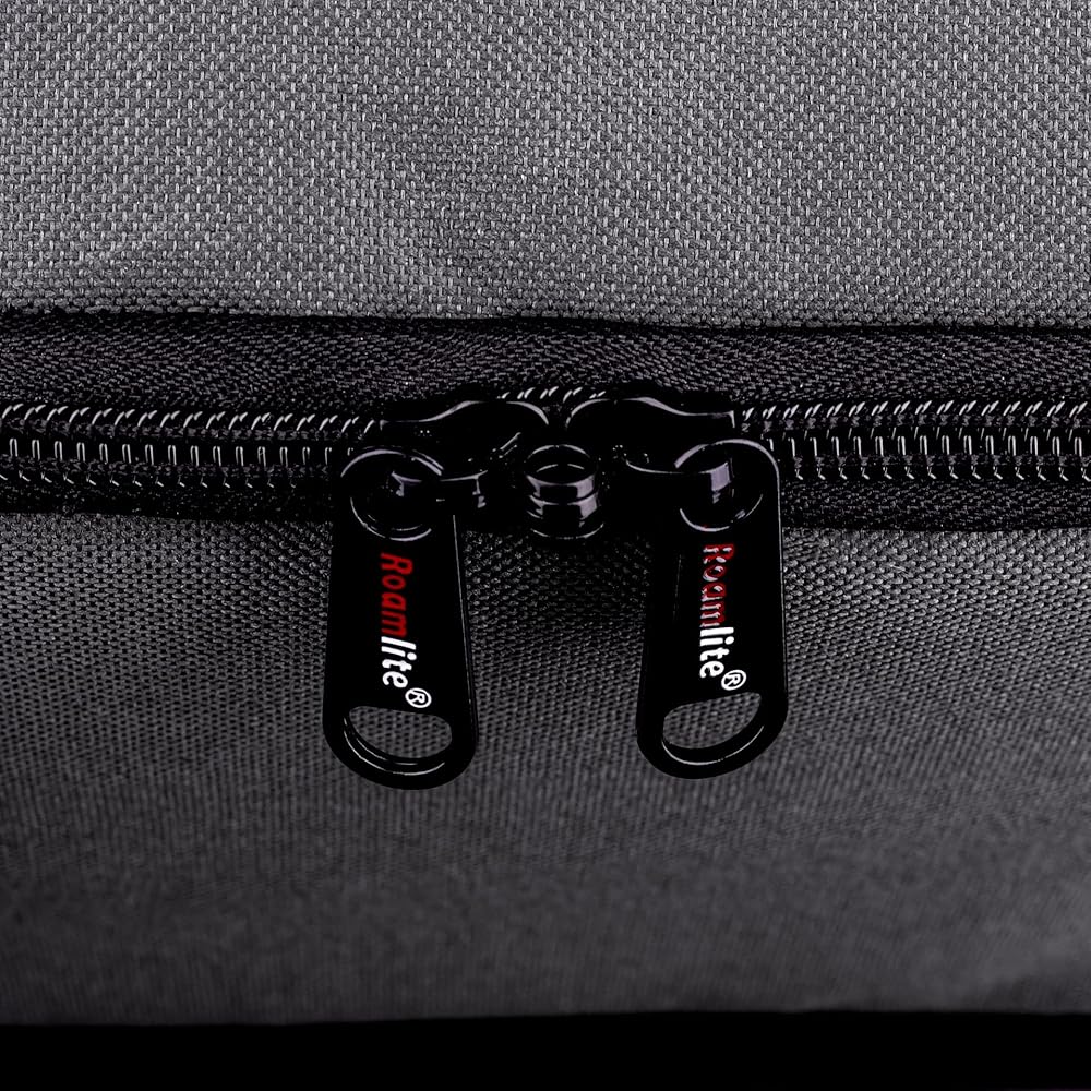 The Roamlite RL57 travelbag is made of 600 denier woven polyester and nylon, this is water-resistant, light rain or water will flow off. This versatile and robust duffle has 2 top carry handles which Vel-cro together and a long adjustable and detachable seatbelt strength shoulder strap. There is a zip running the around 270 degrees of the top of the bag. The main zips are interlocking and lockable using a small padlock. On the back of the bag is material slip which slip over any suitcase or trolley case retractable handle, for easy carrying on top of your case so it doesn't fall off when travelling.