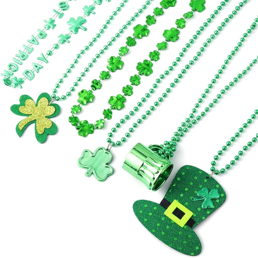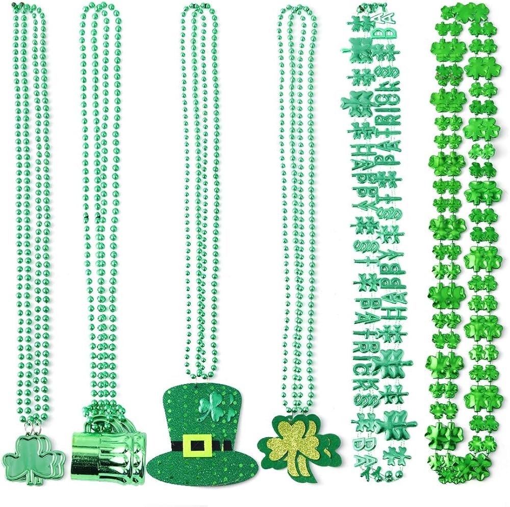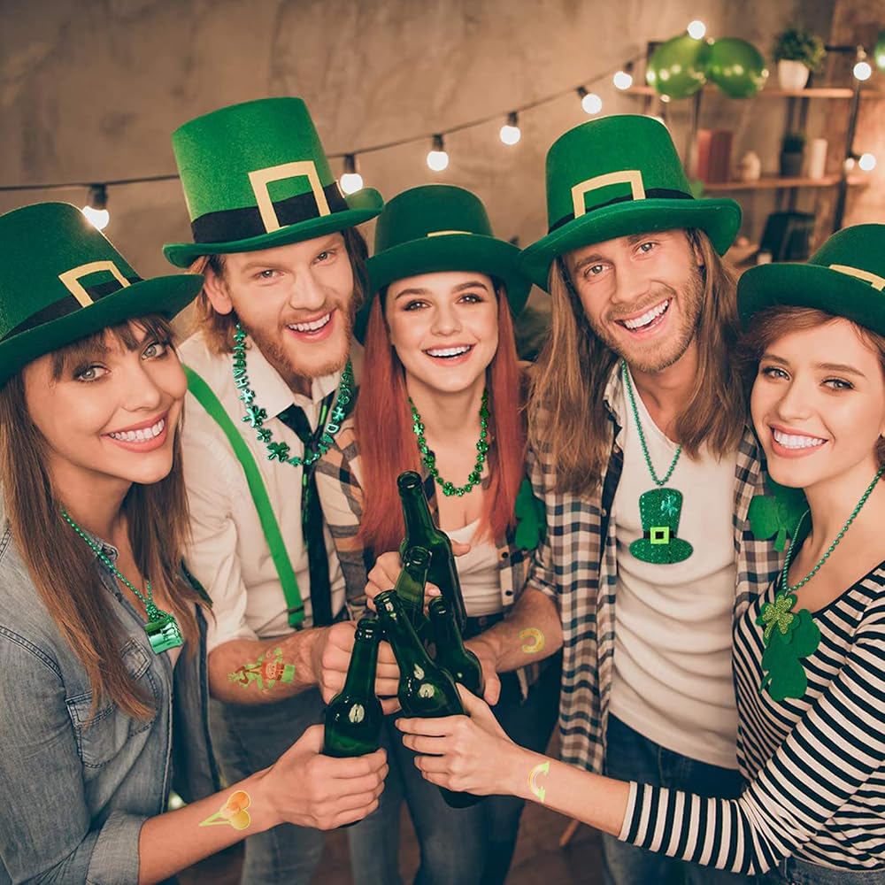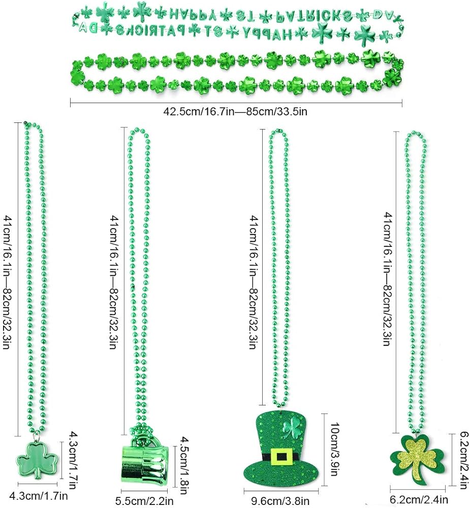 Package Includes☘️:2 pieces Tattoo sticker,Totally 12 pieces of necklace,6 Types,but all in traditional St. Patricks Day elements of shamrock and green hat,some are combined with green glitter beads and fabric clover, some are combined of green letters of happy St. Patricks Day,and etc.