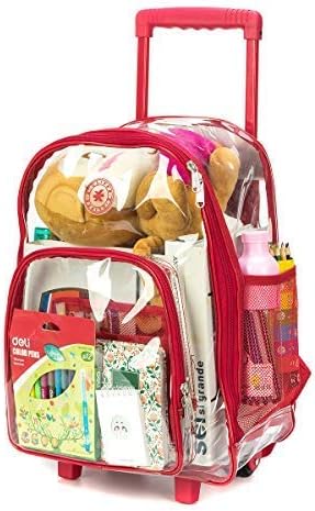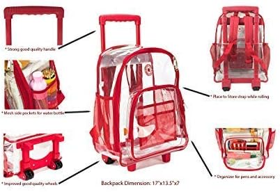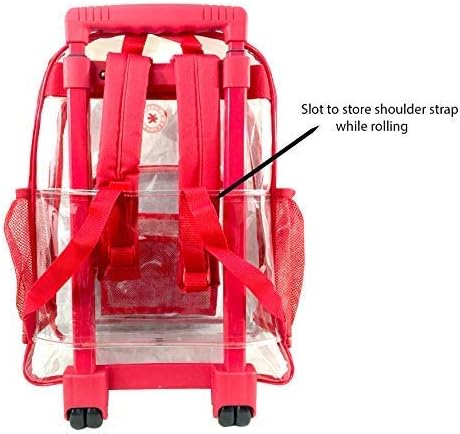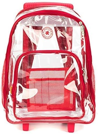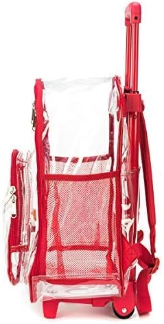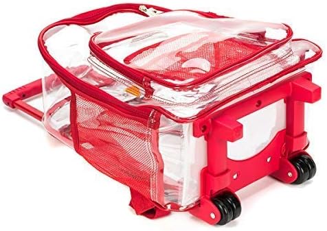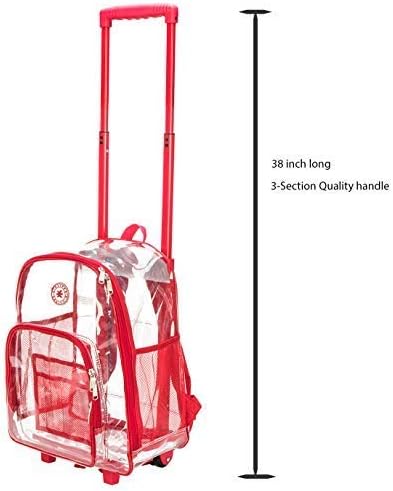 This is the rolling backpack version of one of our best selling clear backpacks! Lightweight yet durable, this clear school backpack is perfect for schools who require see through backpacks as well as showing off your goods. Measuring 17 by 7 by 13.5 inches, the simple interior provides plenty of space for school books, notepads, folders, personal items, and more, while its completely transparent design makes it easy to see what's inside. If things get too heavy for the shoulders, tuck the straps in and pull out the 38-inch 3-section handle and roll in style. Specifications Material: 0.5mm Thick PVC PlasticBackpack Dimension: 17"x13.5"x7" Handle Height: 38" CAUTION: When utilizing the rolling feature on the backpack, ensure that shoulder straps are stored inside the flap to avoid damage to straps while rolling.*Tuck Shoulder straps into back padded panel to avoid damage to straps. Note: The manufacturer warranty on this product lasts 30 days from your date of purchase. Manufacturer warranties cover only manufacturer defects and zipper mechanism damages from normal intended usage.