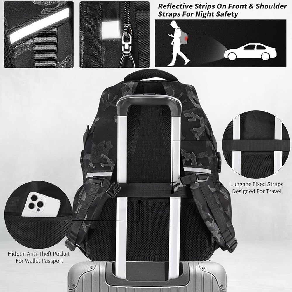 ✅✅【Secure and Travel-Friendly Features】- The backpack is equipped with high-quality zippers to ensure the secure closure of compartments. it has a hidden anti-theft pocket where you can safely store your wallet and smartphone. the backpack also features reflective strips on the front side of the backpack & the shoulder straps, ensuring visibility and safety during nighttime activities. the luggage fixed straps allow you to attach the backpack to a suitcase for easy transportation.