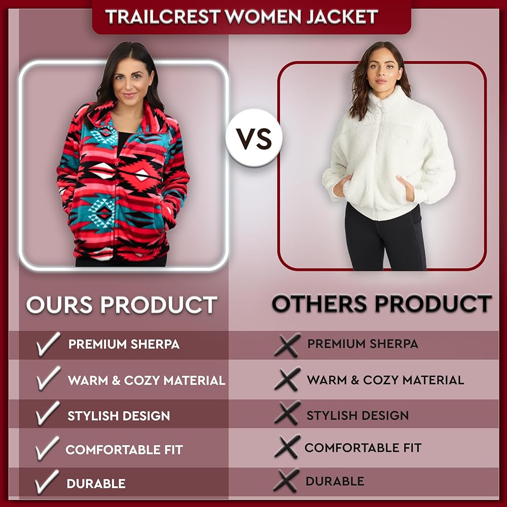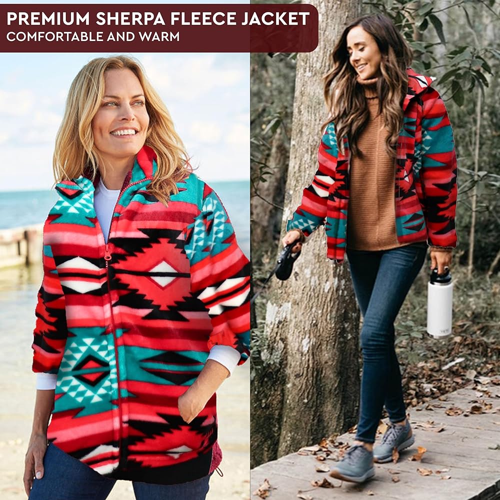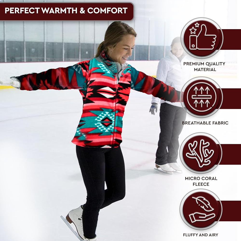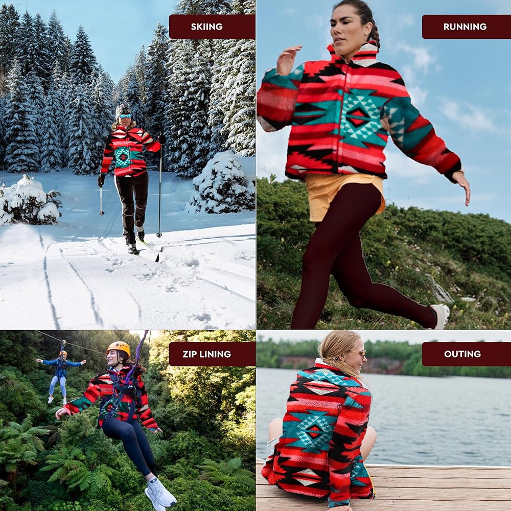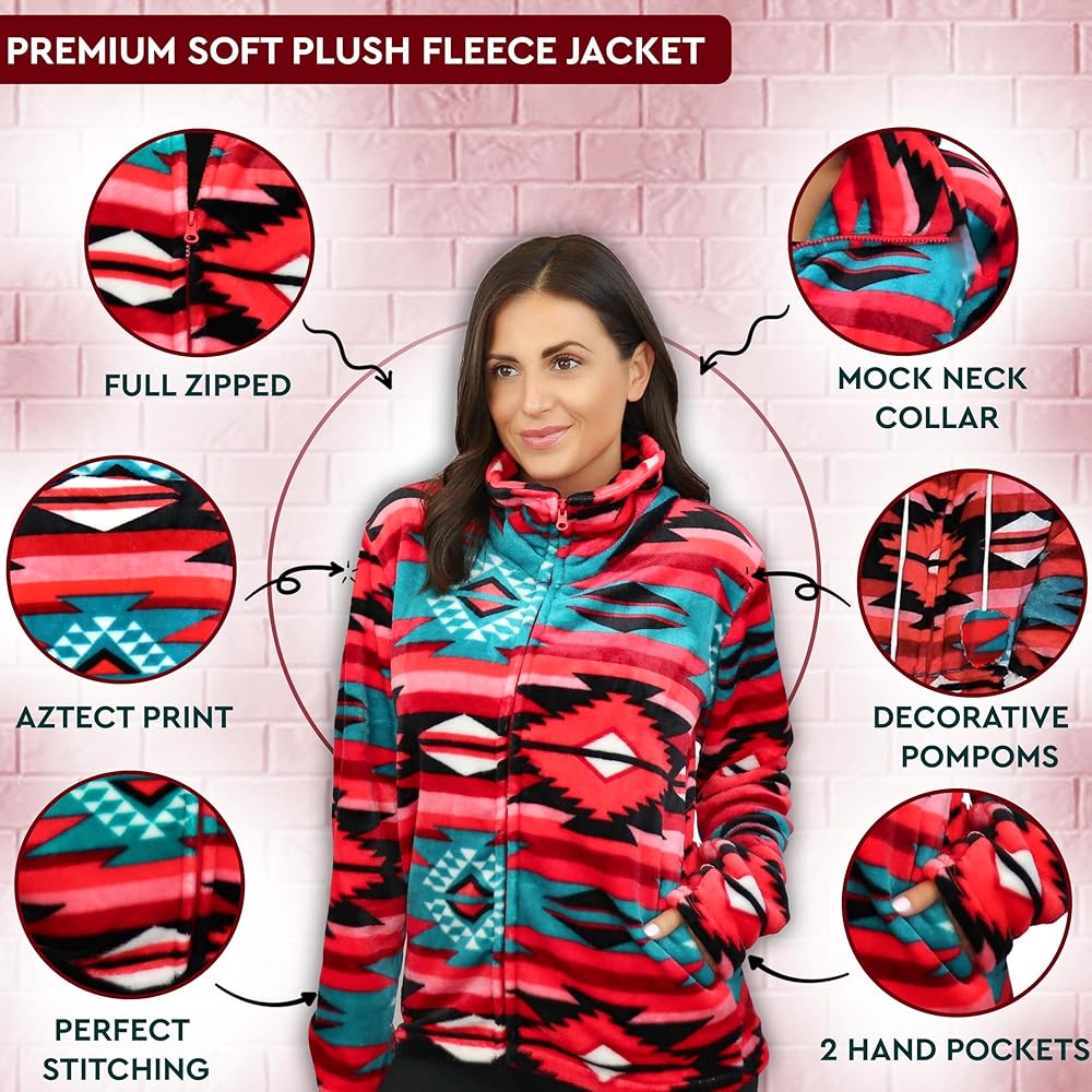 ▲ FEATURES: Fitted cuffs, mock neck collar with pompom drawstrings, full front YKK zipper closure, roomy side pockets, fun and stylish Aztec and Ikat prints.
