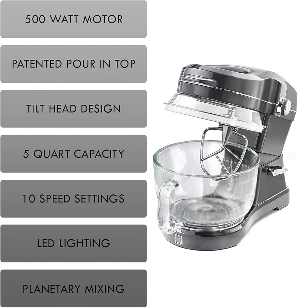 Includes Exclusive Accessories: Comes with interchangeable flat beater, dough hook and wire whisk; 5 qt glass bowl with storage lid; and wide-mouth funnel, egg separator, and ingredient grater/zester designed to fit the Ovation's pour-in opening