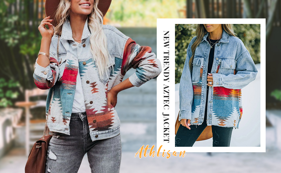 Athlisan Women's Aztec Print Shacket Lapel Botton Down Shirt Jacket