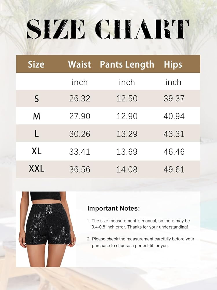 【WHAT YOU GET】1x sequin shorts women, the women's sequin a line shorts are available in S/M/L/XL/2XL, there's always a size for you. Women cute loose fitted sequin shorts have a loose waist with some elasticity, please read the size chart carefully before purchasing.