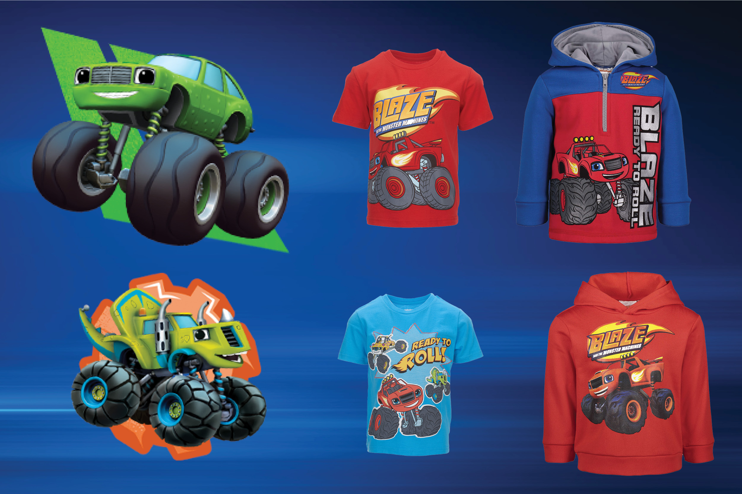 Featuring your favorite truck characters: Blaze on red, Zeg on blue and Stripes on yellow