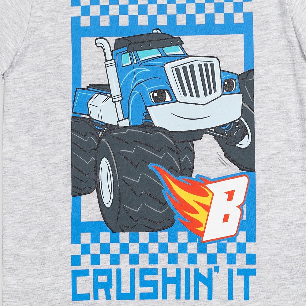 Come join Blaze and his monster truck friends on their adventures in Axle City! In this cool Blaze and the Monster Machines Short Sleeve T-Shirt solve STEM problems with Blaze and AJ, race against Crusher, and help friends like Stripes, Zeg, Starla, Darington, Watts, and Pickle. Your child will love wearing this short sleeve graphic tee shirt featuring his favorite monster trucks.