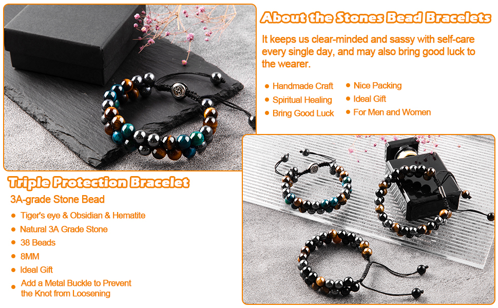 ▶【100% Handmade Bracelet】We make everything ourself in our family workshop. This triple protection healing crystal bracelet is made of 8/10mm natural black obsidian stones,tiger eye and hematite stones.The exquisite hand-made makes it very strong in structure,never worry about fading and breakage.
