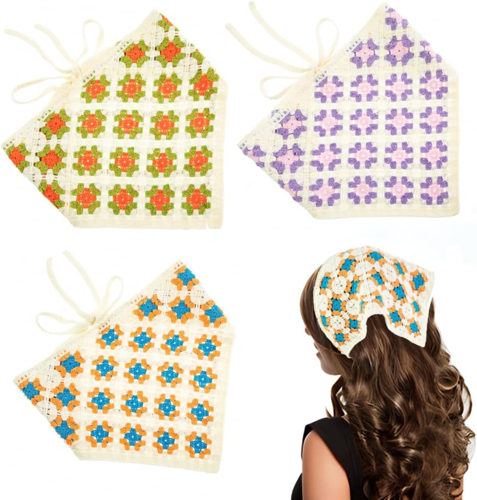 3 PCS Crochet Bandana for Women Triangle Floral Headscarf Knitted Hollow Hair Scarves Head Bandanas for Women Girls