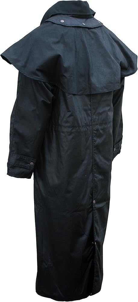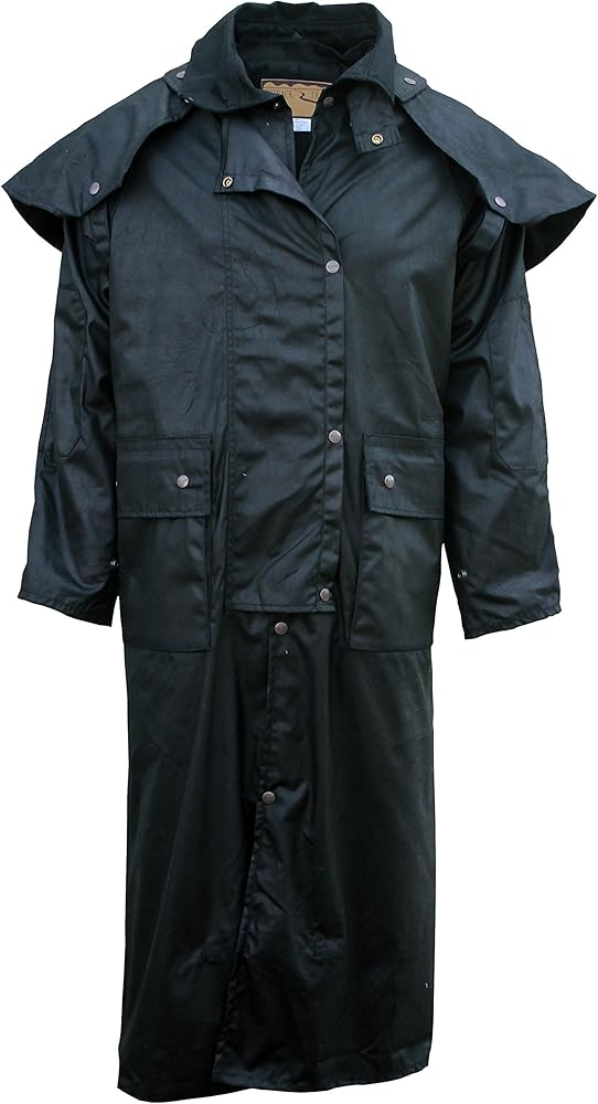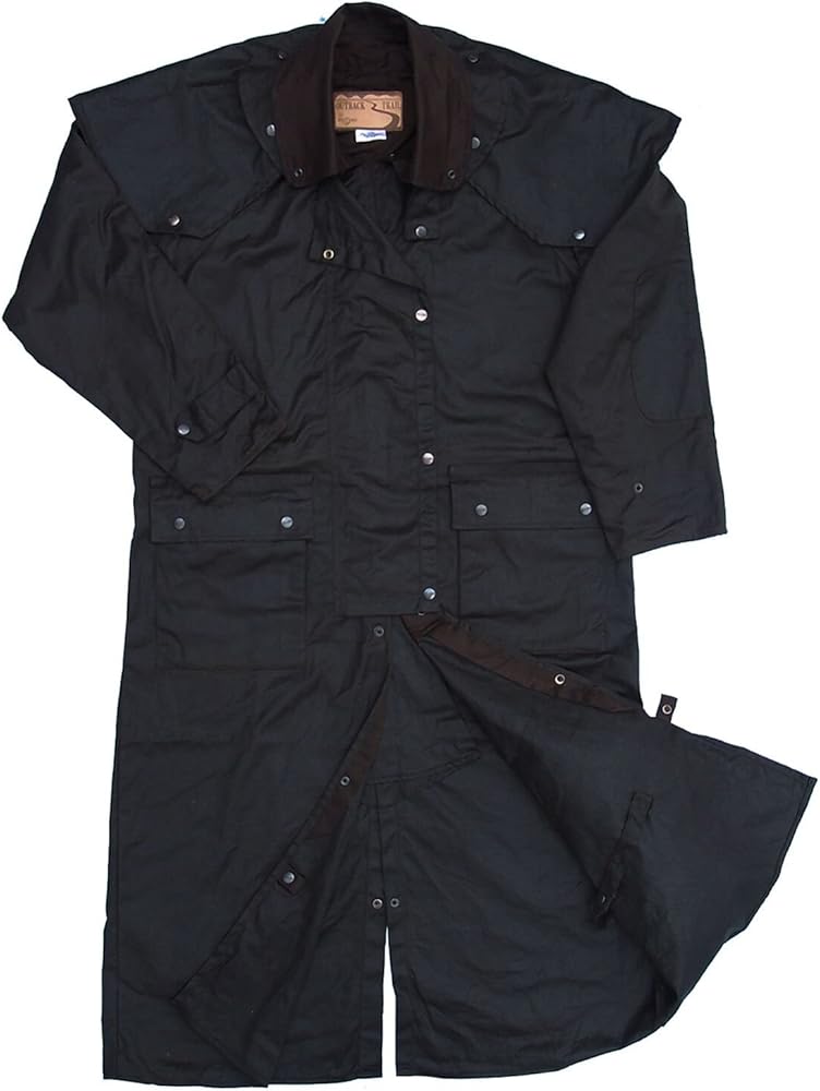 MEN'S LONG OILSKIN WESTERN AUSTRALIAN WATERPROOF DUSTER COAT FOR PROTECTION FROM THE ELEMENTS: Our men's long Western Australian riding coat has all the weather-guard features you expect. It offers good wind protection, and its waterproof features include a second placket protecting the snapped front closure, an extra layer of material on the sleeve forearms and a removable cape with storm flap over the top seam to provide more protection for the shoulders and back. The cape has snapped straps under the arms to prevent the cape from flying up in the wind. This duster coat has practical features ideal for the active outdoorsman. The fantail back of this oilskin coat allows freedom of movement and can be snapped closed or left open depending on the amount of movement you need. The two outside patch pockets are equipped with handwarmer pockets underneath. The sleeves are lined in taffeta fabric to prevent catching your shirt or sweater when you put it on. The cotton lining makes this coat breathable and comfortable to wear. Available in black or brown, our men's full-length Australian oilcloth coat comes in sizes XS to 3XL. The drawstring waist provides customizable adjustment to cinch as snug or loose as you prefer. The adjustable snapped straps on the cuff give you the fit and weather protection you want. Made from 100% heavyweight waxed cotton, this men's long waterproof coat is durable and rugged enough for all your outdoor adventure activities. The cotton lining is breathable and keeps the warmth in. This Australian riding coat is hand wash only. Our Outback Trail Riding Coat is quality made with durable, heavyweight fabrics and attention to detail that makes it the perfect coat for all your outdoor activities, including working in the elements. This men's waterproof coat is also stylish enough to wear in the city.