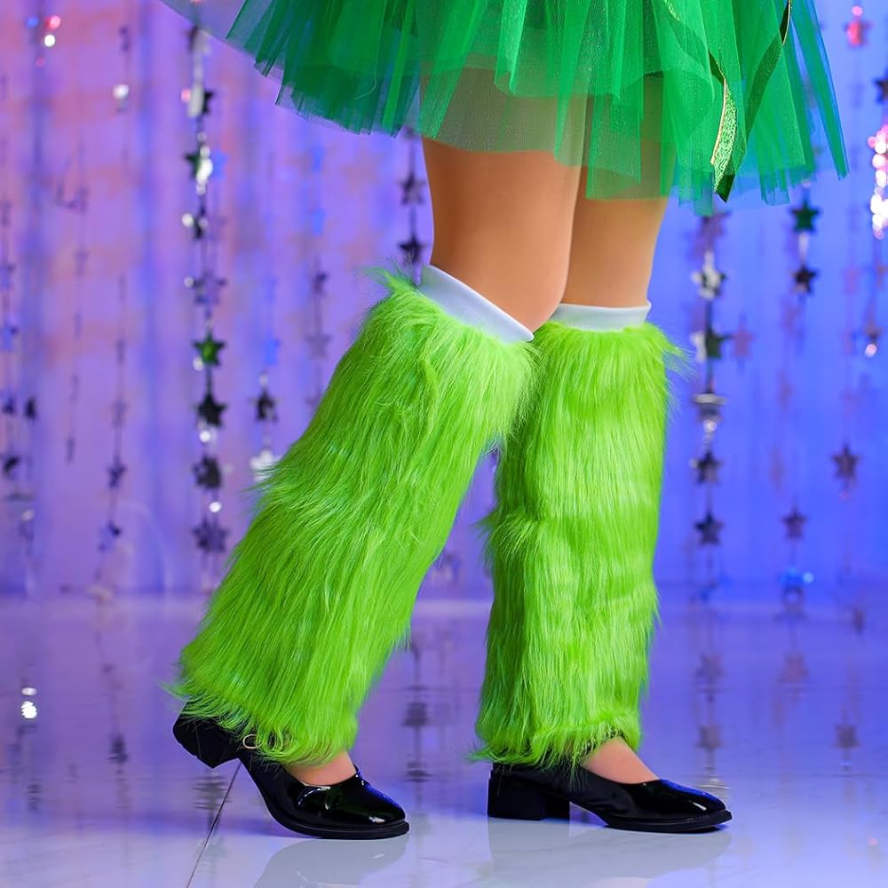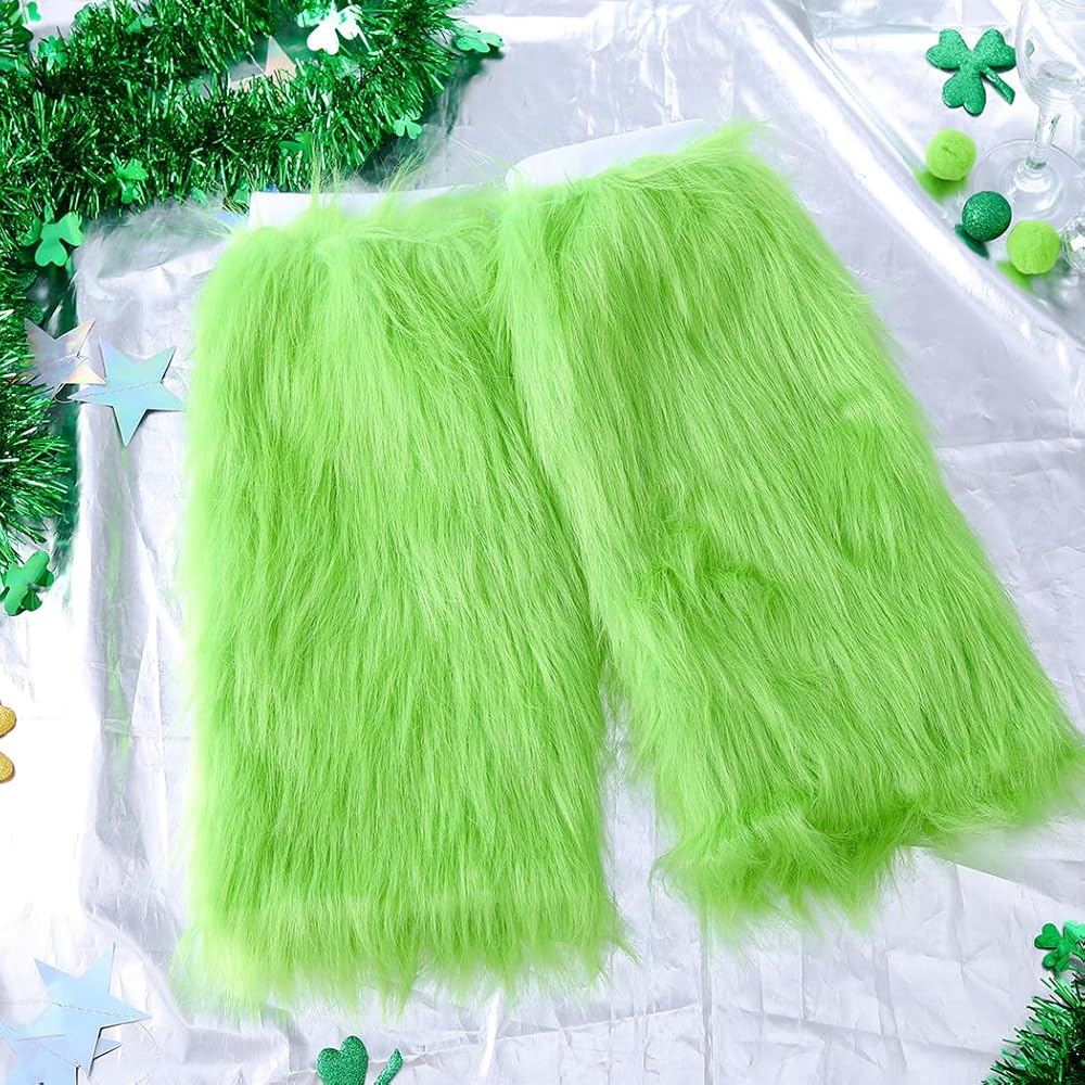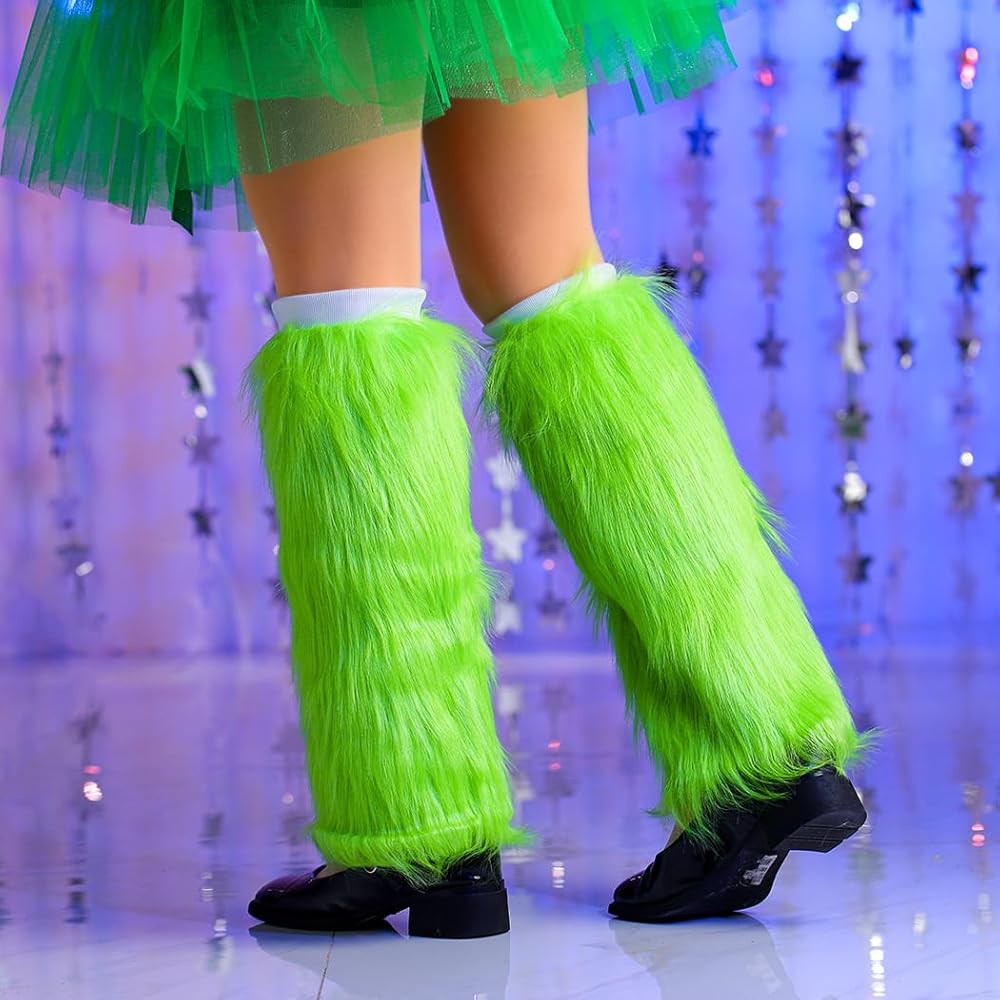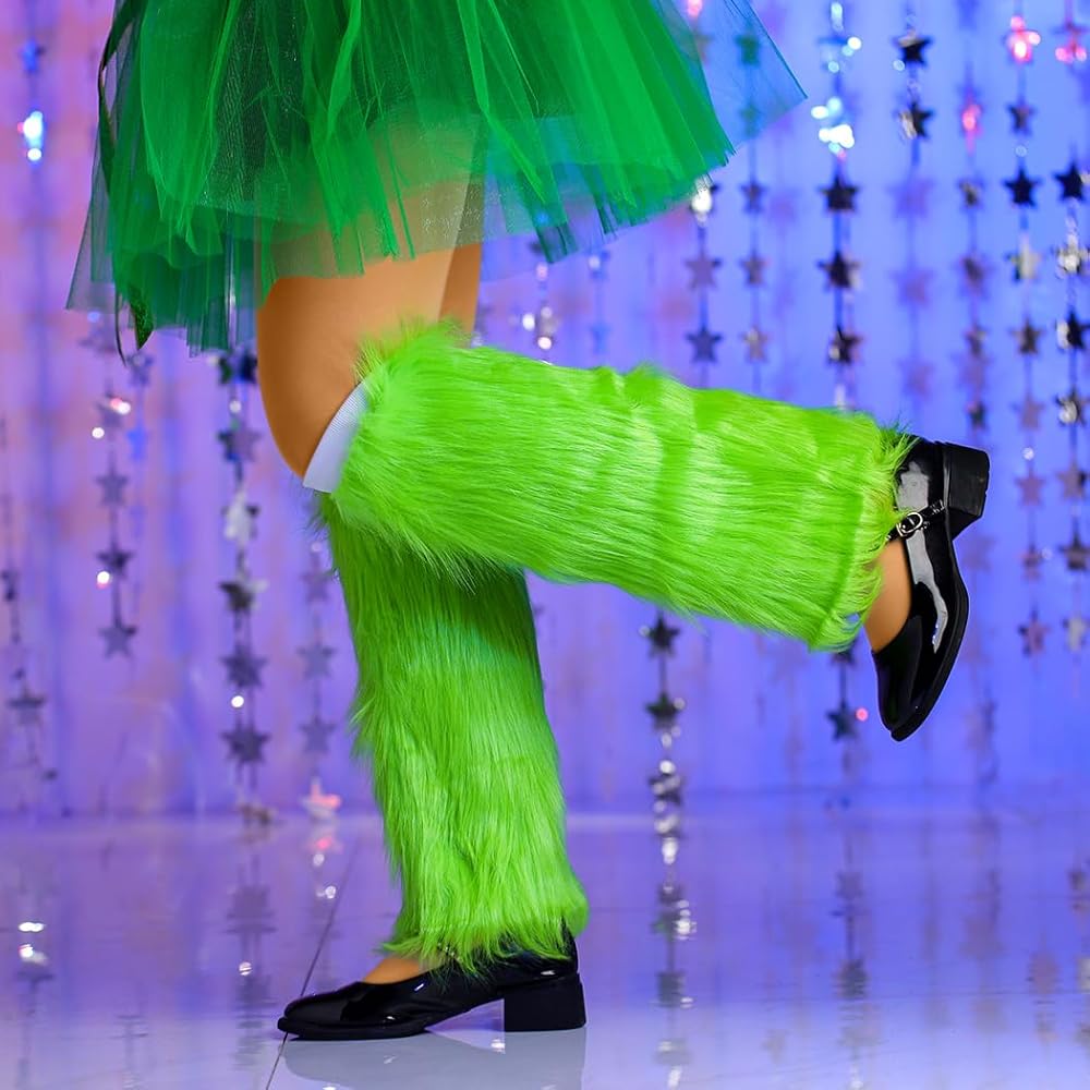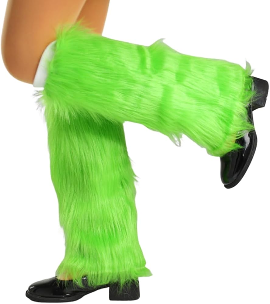 Green, gold, and purple artificial fur leg warmers. This leg warmer is 18 inches long with white elastic cuffs, so you don't have to worry about size issues