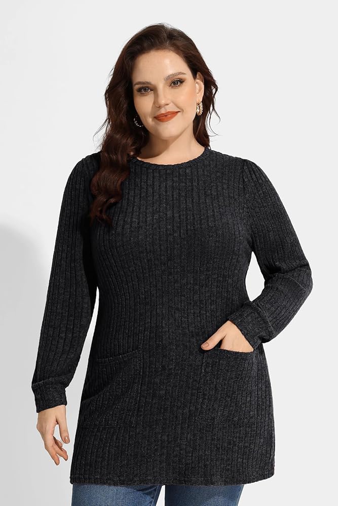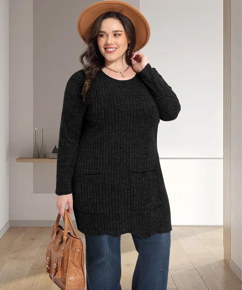 【Design】Two pocket, invisible stripes, classic round neck, various solid colors, casual and versatile. Plus size lightweight sweater with tunic length freely to covering your butt.