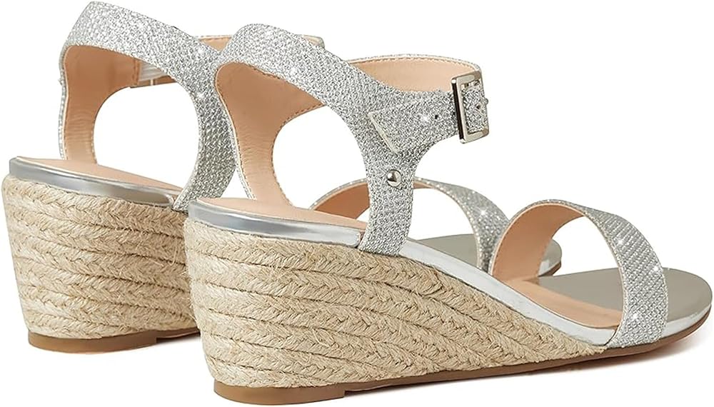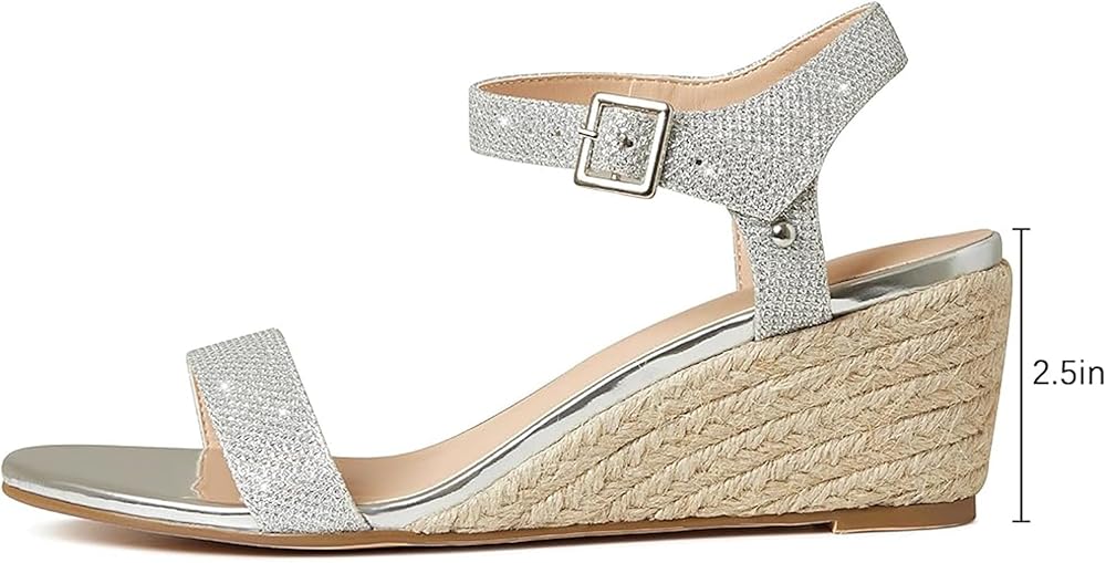 {Material}The summer wedge sandals for women taken use of sparkly glitter uppers which is shining and bling sandals. support foam is soft and can help to smooth the weight. anti-slipper rubber outsole are durable and hlep to grab the earth stablily.