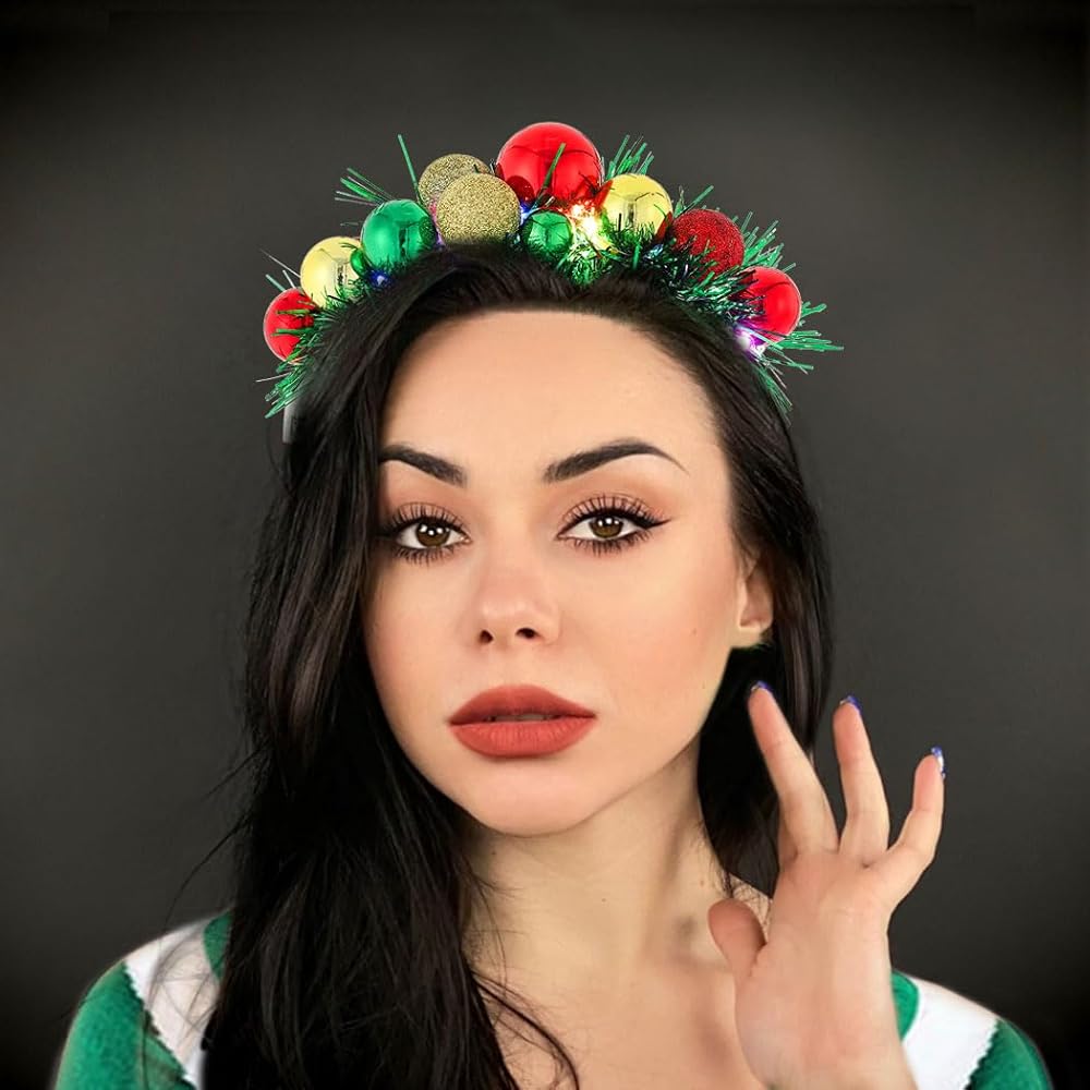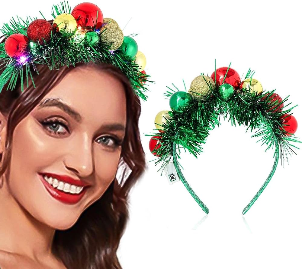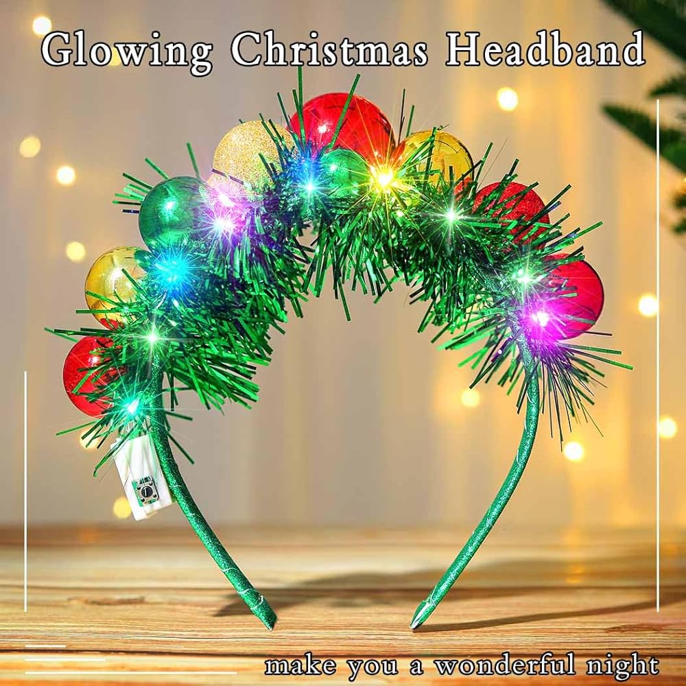 Light up Christmas headband made of quality material and led light, handmade, delicate and durable, lightweight and comforatable to wear. Classic Christmas colors, such as green, red, gold, silver, perfect for your Christmas outfit, Add to the festive atmosphere.