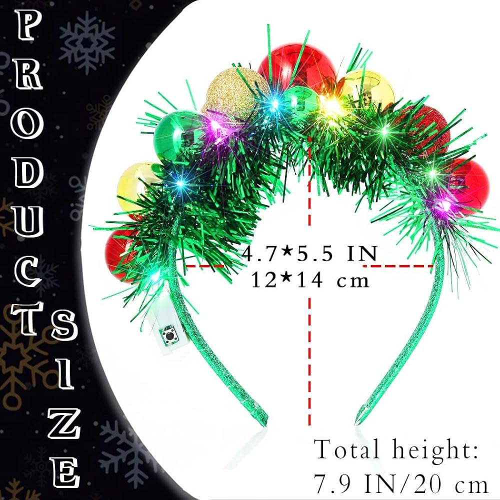 Glowing Xmas hairband size approx 4.3 IN*5.1 IN. Led Xmas ball headband has good elasticity, Free size fits most women and girls. You can give Christmas headbands as gifts to your family, colleagues or friends. which are stylish decorations for Christmas costumes and enjoy a happy day together