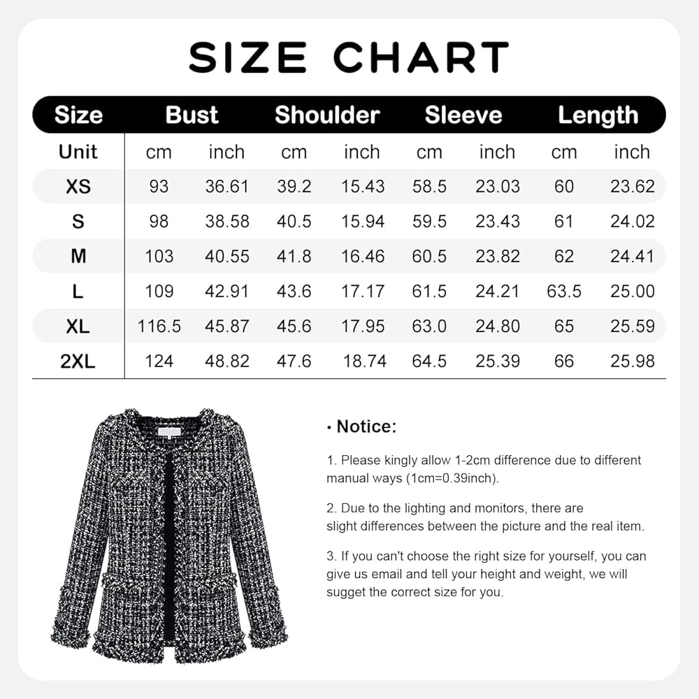 Leyoutx Womens Elegant Chunky Tweed Casual Slim Checker blazer Jacket features round neck, long sleeve, classic contrast color tweed pattern, fringed trim, lined.
