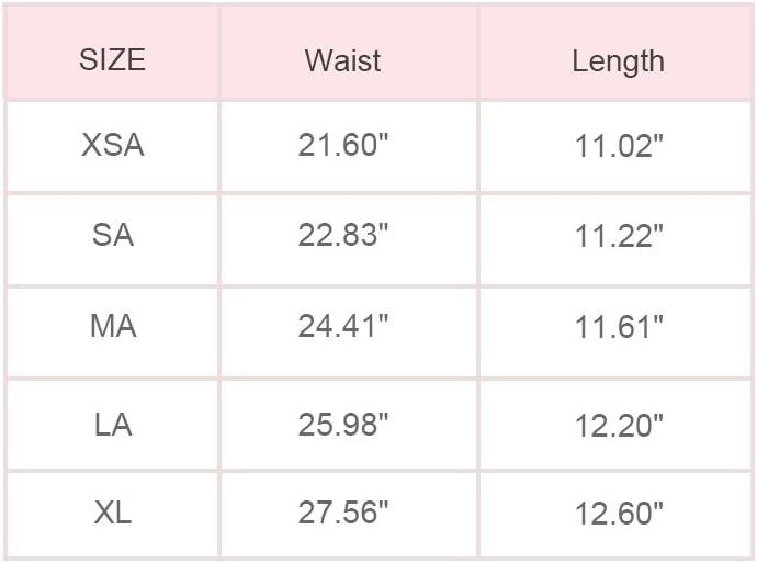 XSA: waist 21.60", length 11.02"; SA: waist 22.83", length 11.22": MA: waist 24.41", length 11.61"; LA waist 25.98", length 12.20"; XL waist 27.56", length 12.60".
