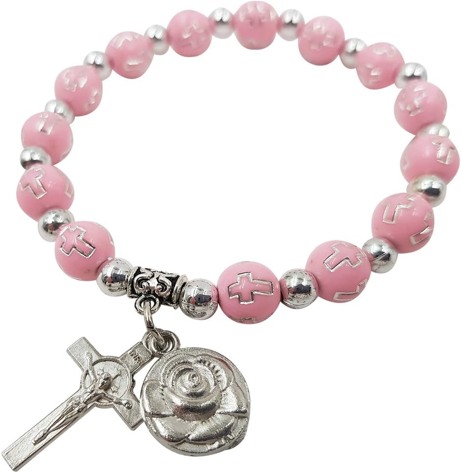 Pink Rosary Beads Catholic Bracelet For Women Stretch Bracelet with Rose & Cross Charm