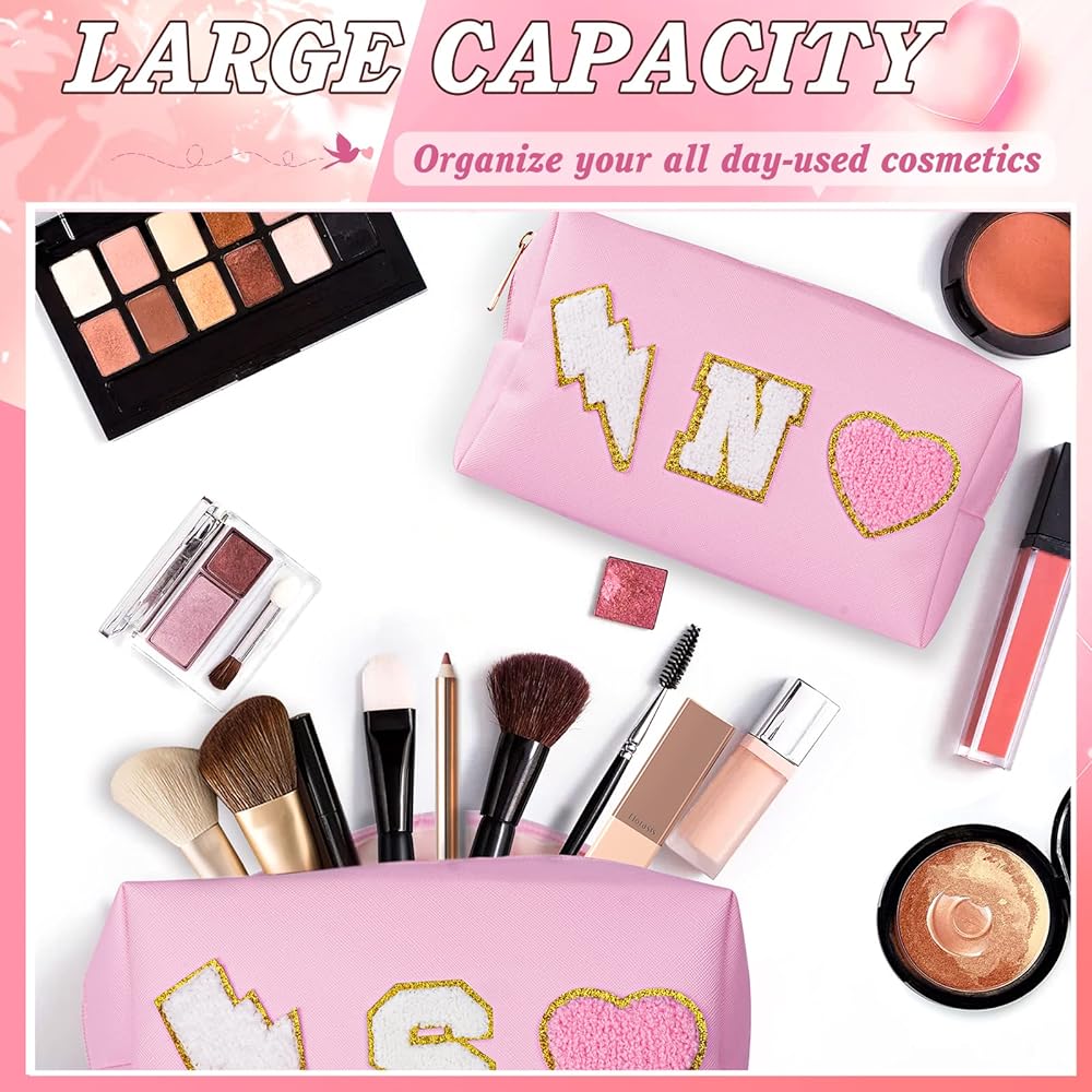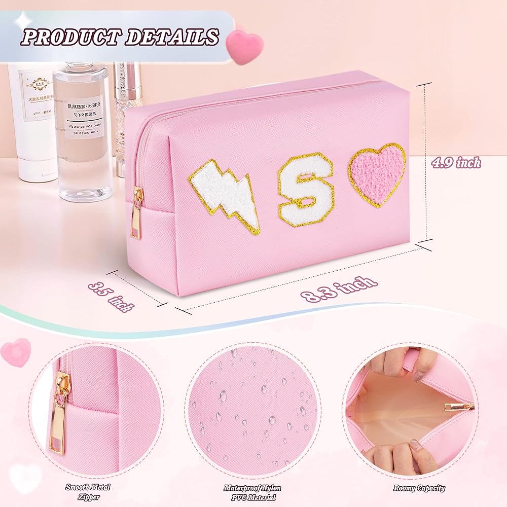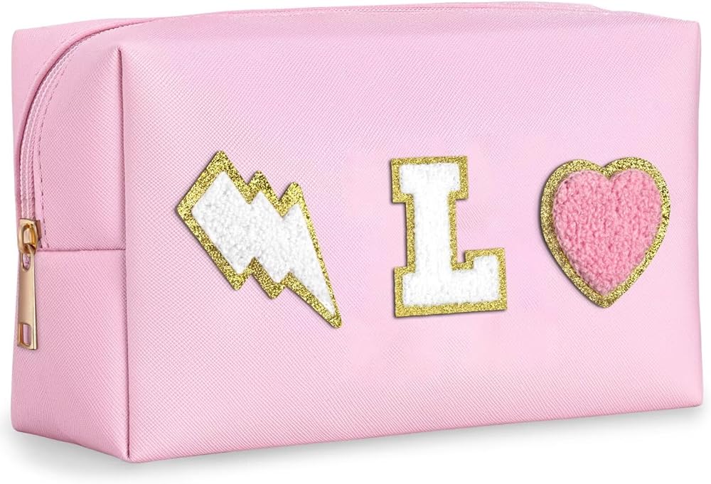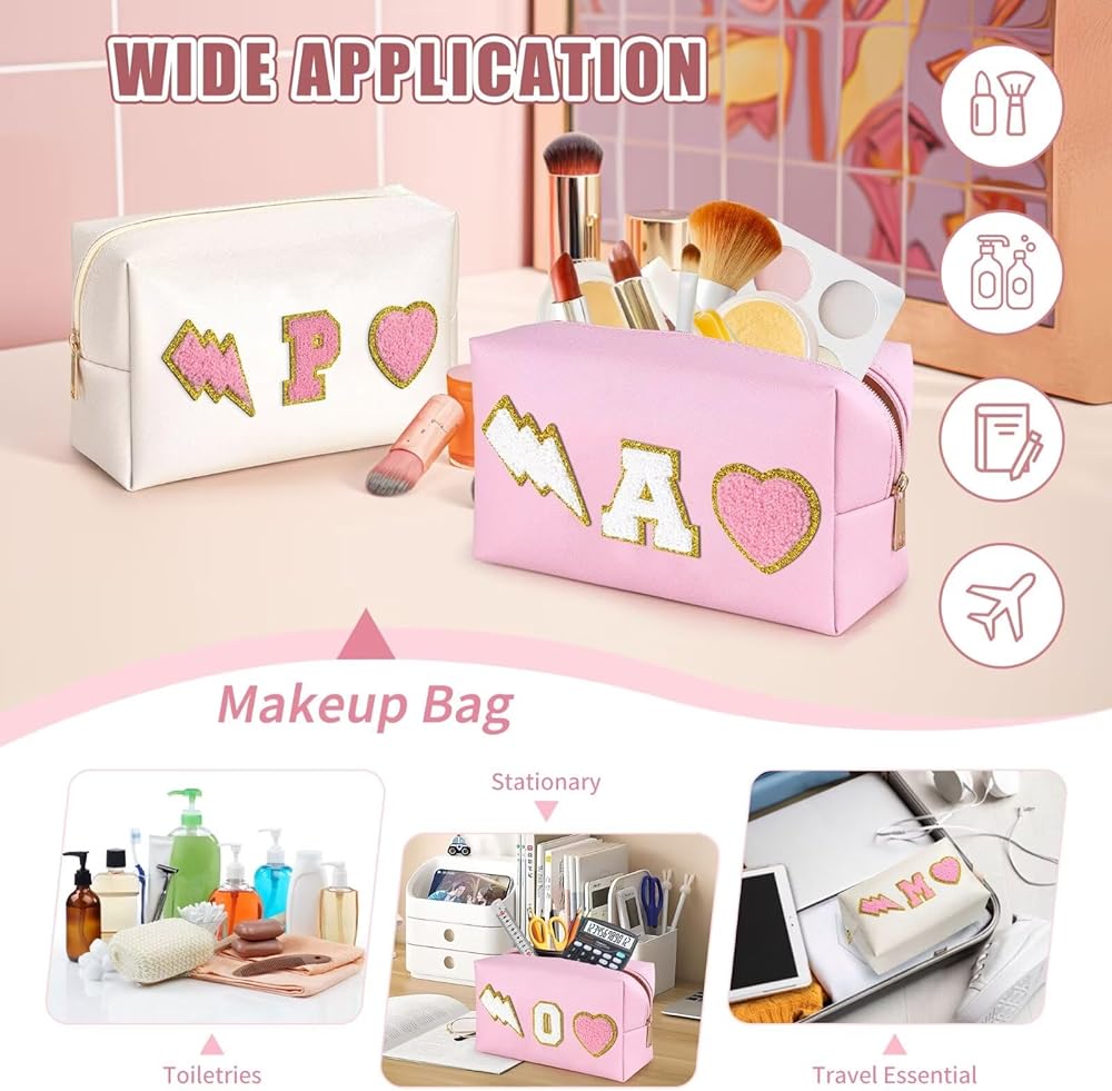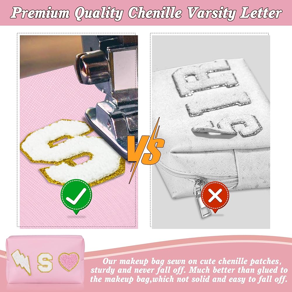 👝Exquisite Design: Cute make up bag decorated with chenille patches--letter, lightning and heart, stitched not glued, sturdy not easy falling off. These trendy and lovely elements are made from towel embroidery, and come with a gold glitter edge, no redundant threads, which is chic and delicate, adding a pretty feeling to your bag.