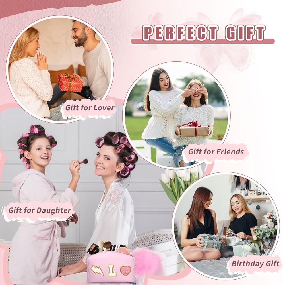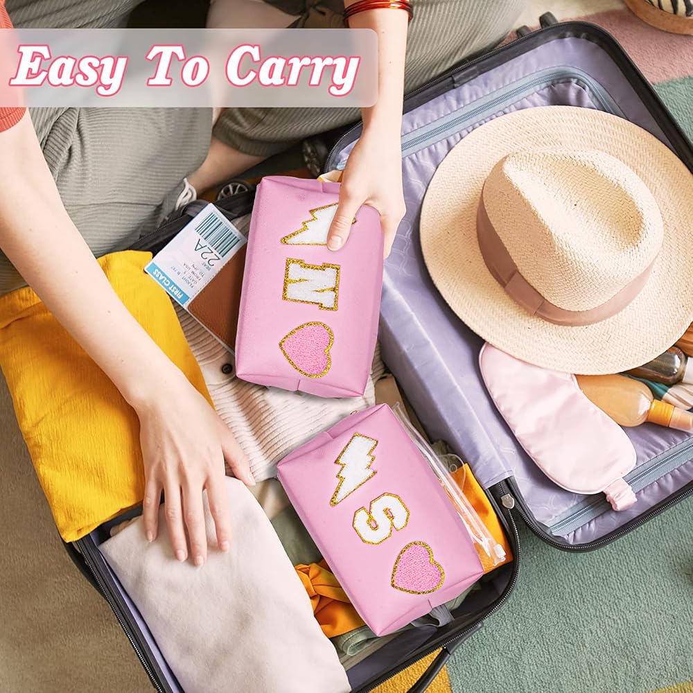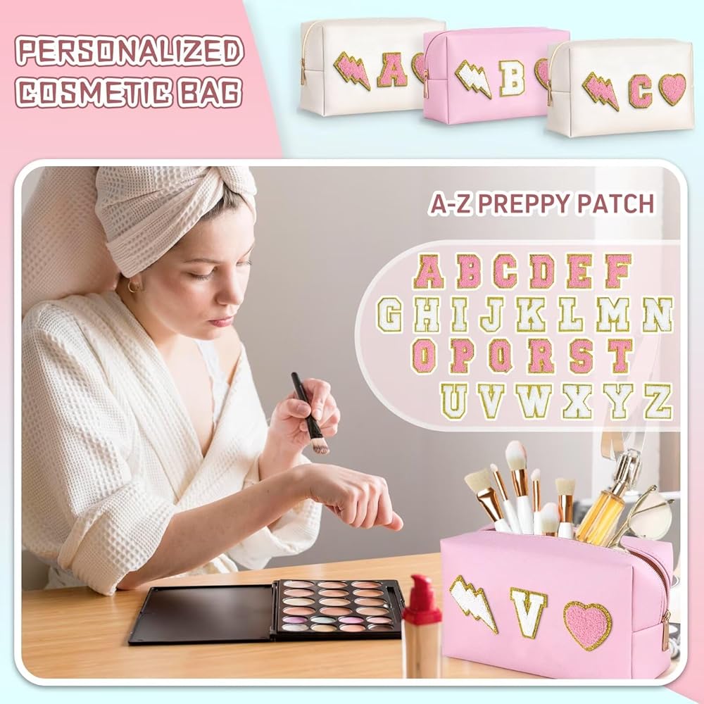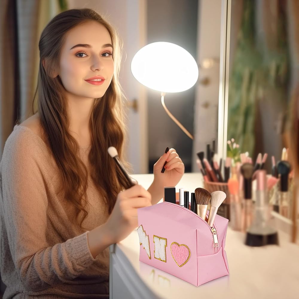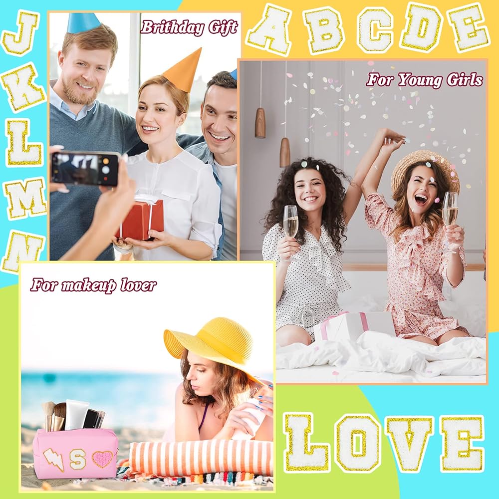 👝Exquisite Design: Cute make up bag decorated with chenille patches--letter, lightning and heart, stitched not glued, sturdy not easy falling off. These trendy and lovely elements are made from towel embroidery, and come with a gold glitter edge, no redundant threads, which is chic and delicate, adding a pretty feeling to your bag.