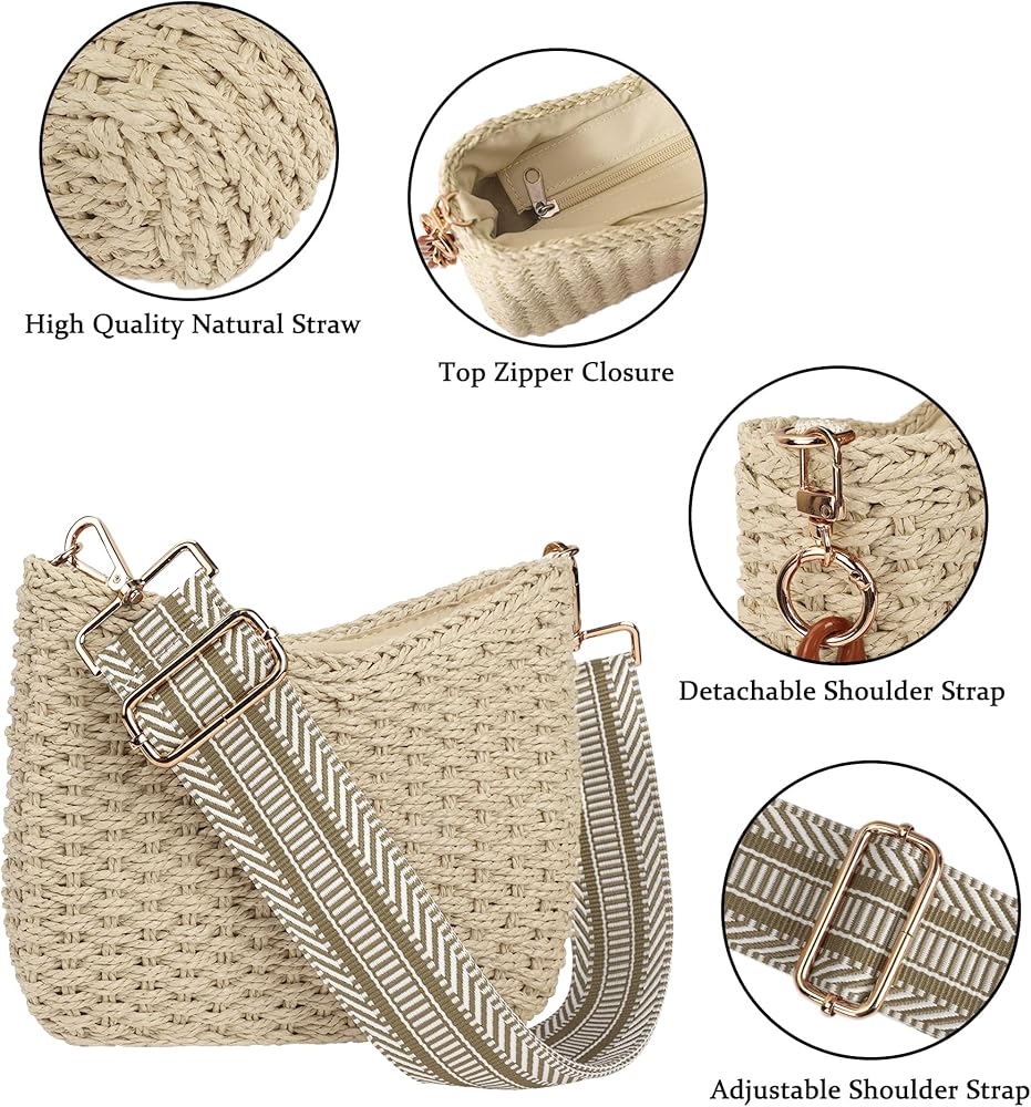 Women Straw Small Crossbody Bag Handmade Woven Shoulder Handbag Summer Beach Purse with Guitar Strap | Straw, Small, Handmade, Woven, Shoulder, Summer, Beach, Guitar Strap