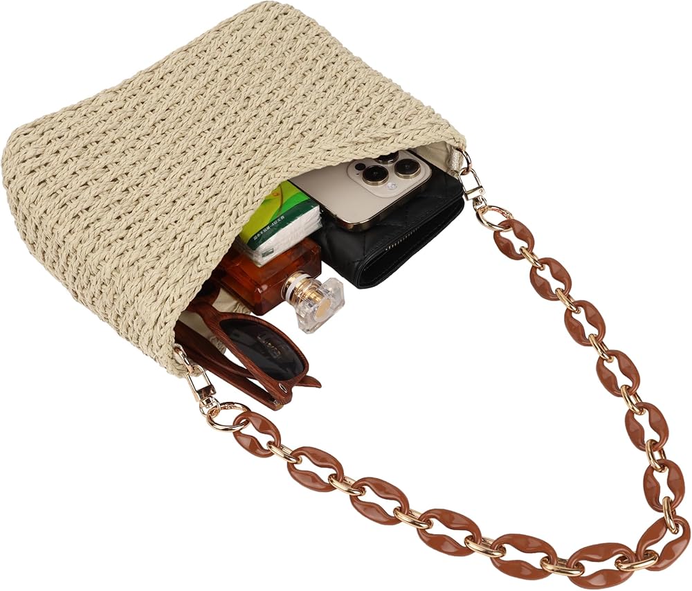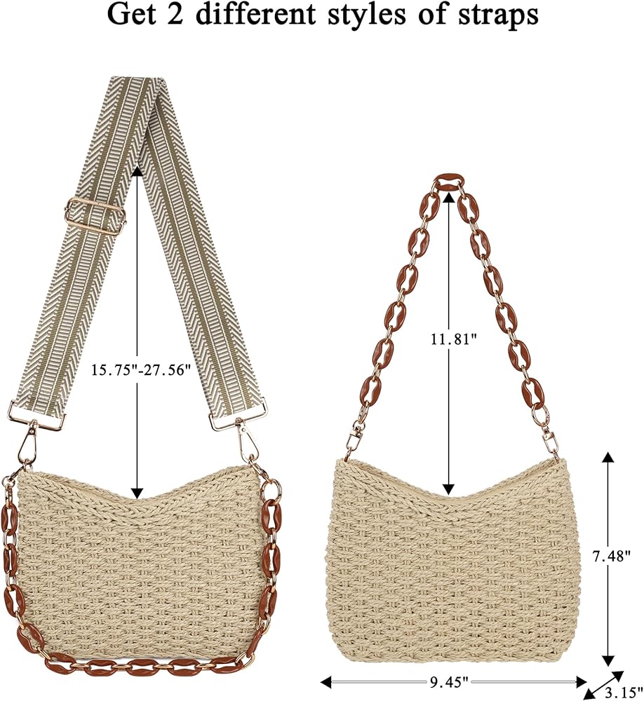 【Small Size】The dimensions of straw crossbody bag for summer are around 7.48" H x 9.45" W x 3.15" D; Acrylic chain strap drop: 11.81"; Guitar strap drop: 15.75"-27.56"; It can be used as a handbags, crossbody bag, shoulder bag, underarm bag or clutch bag