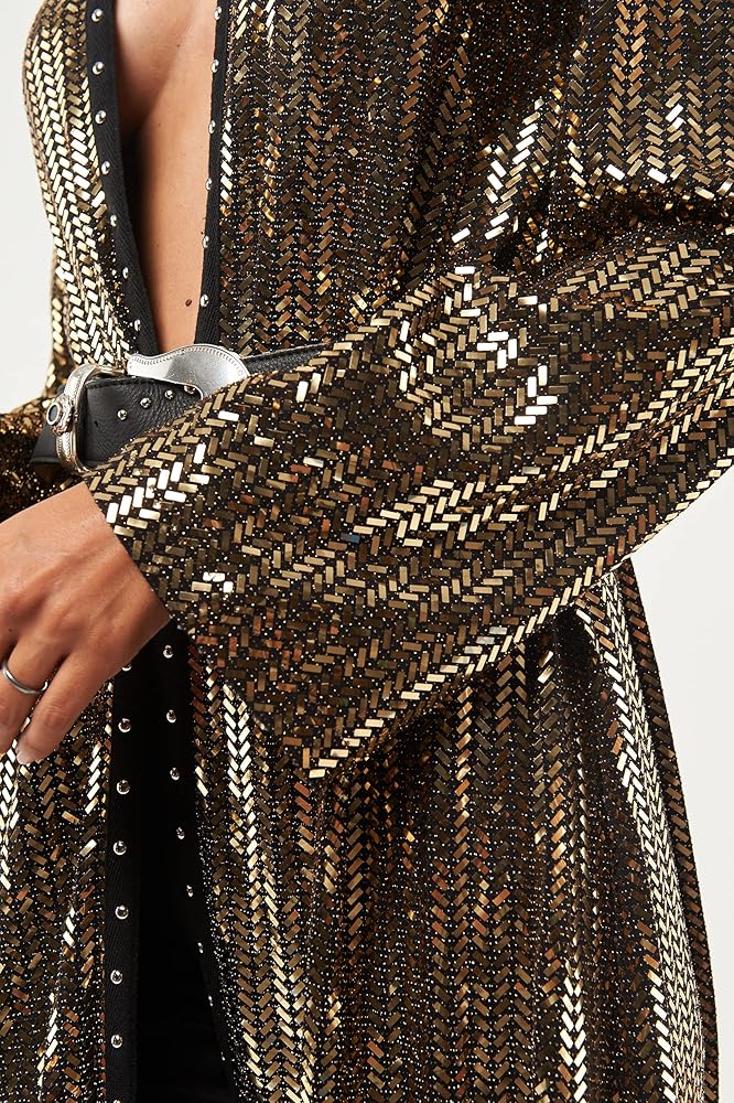 The Ross Tunic long streamlined silhouette is finished with a handmade studs ribbon for a rocker look. It's a collarless, full-length style that is perfectly clean and simple. The Tunic is crafted in a luxurious metallic blend for a sophisticated feel.