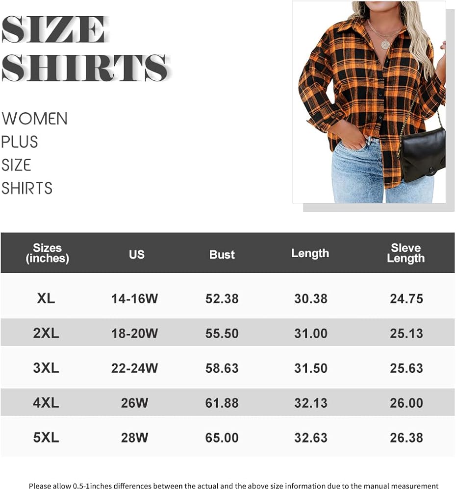 【Size&Note】Please check RITERA size chart to take your usual size. We have size XL - size 5XL. Oversized flannel shirts can hand wash or machine wash on cold, do not bleach for these plus size blouse.