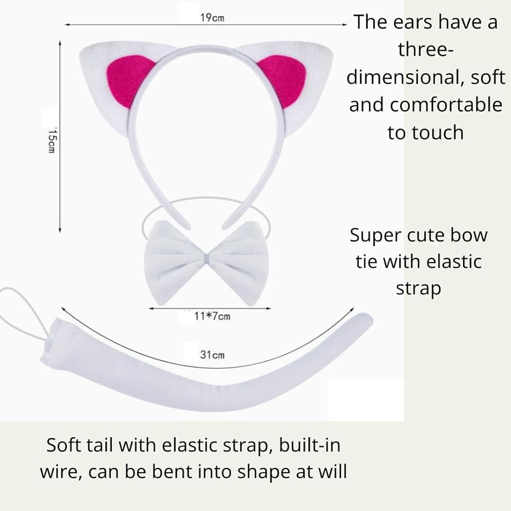 Bowtie: 4.9"x3.7"; Tail length: 13"; Ears Headband length: 13"-13.7". Great costume set for themed birthday parties, Halloween, Christmas, Easter and New Years Eve
