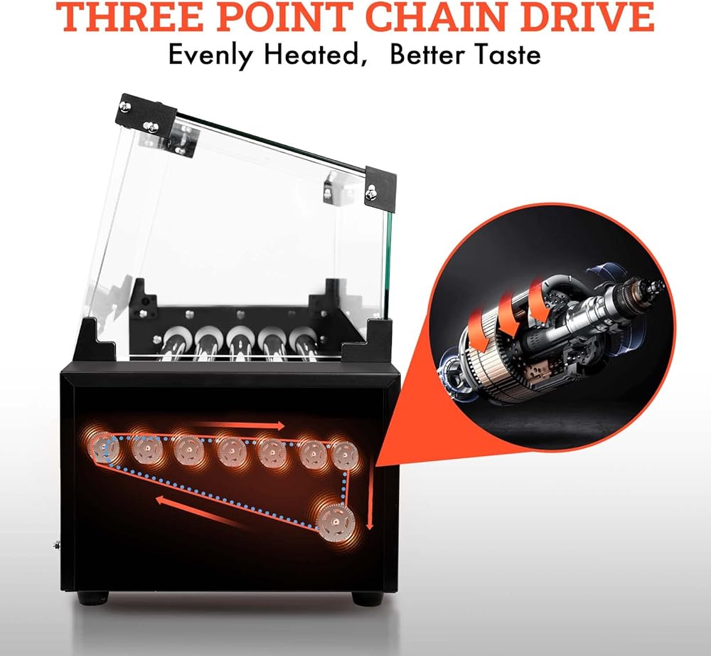 🌮White Noise + Even Heating. The 3-point chain drive design makes the hot dog roller for grilll roll smoothly, so you don't have to worry about burnt or undercooked hot dogs. In addition, The more sophisticated parts that our hotdog machines have allow for silent operation and no noisy noise.