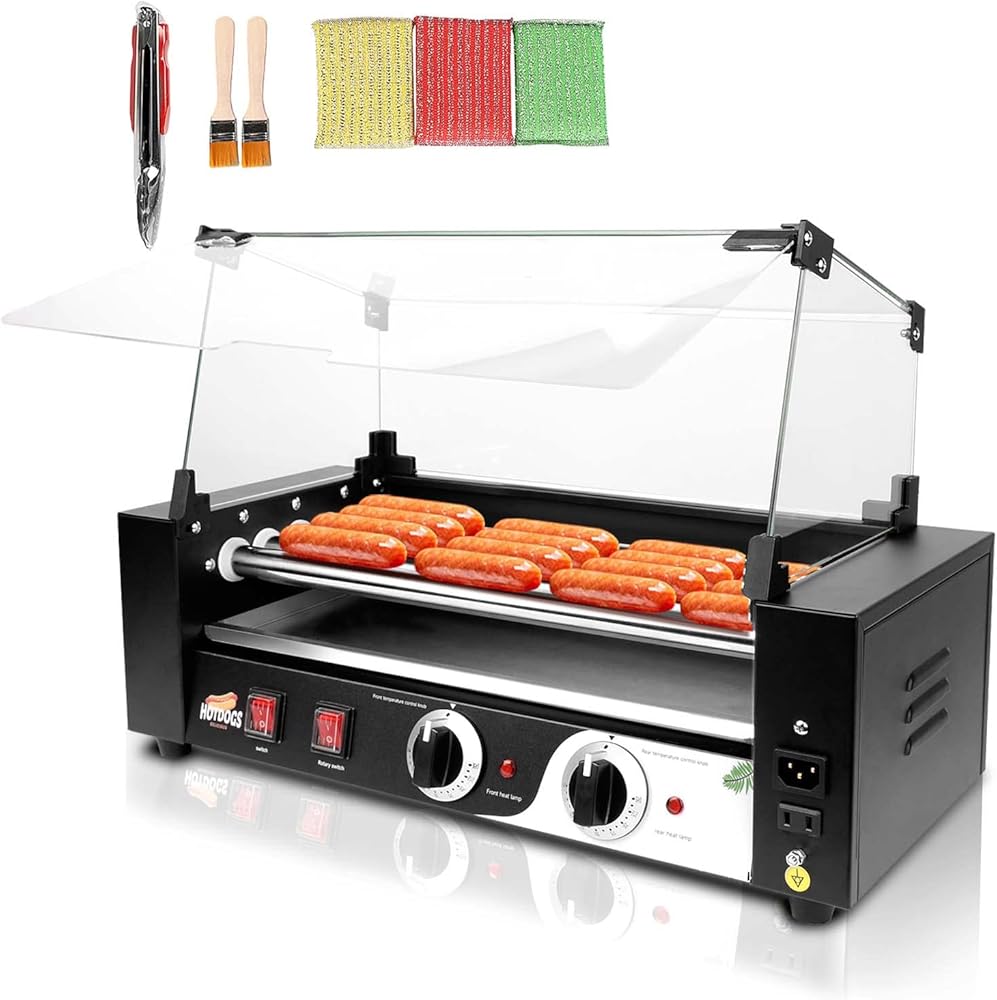 1000W Hot Dog Roller Machine,Dual Temp Control Commercial Grill Cooker Machine with Removable Stainless Steel Drip Tray and Cover, 12 Hot Dog 5 Rollers,Sausage Grill Cooker for Party Kitchen Restaurant