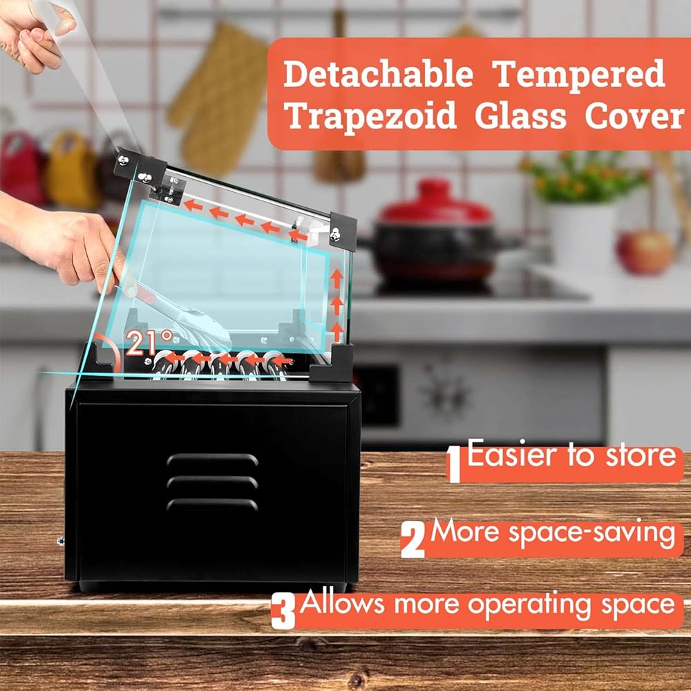 🌮Trapezoidal Removable Glass Cover: Compared to plastic ones,our hot dog roller machine with bun warmer and cover is more heat resistant,easy to clean, transparent and allows for 360 degree panoramic food temptation. Unlike other curved glass covers,our removable trapezoidal glass cover is easier to store, more space saving and allows more operating space.