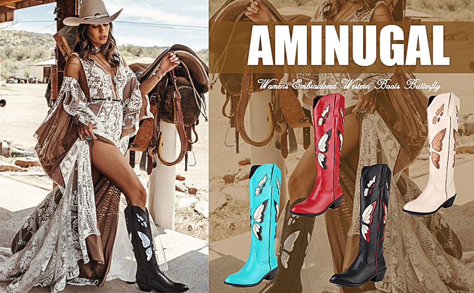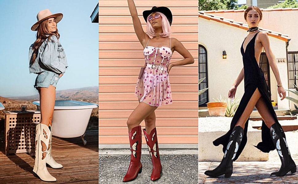 {Design}Western cowboy Boots.mid chunky heel create the perfect casual look. Point toe,vogue embroidered Element: Slip on design make it easy on and off.