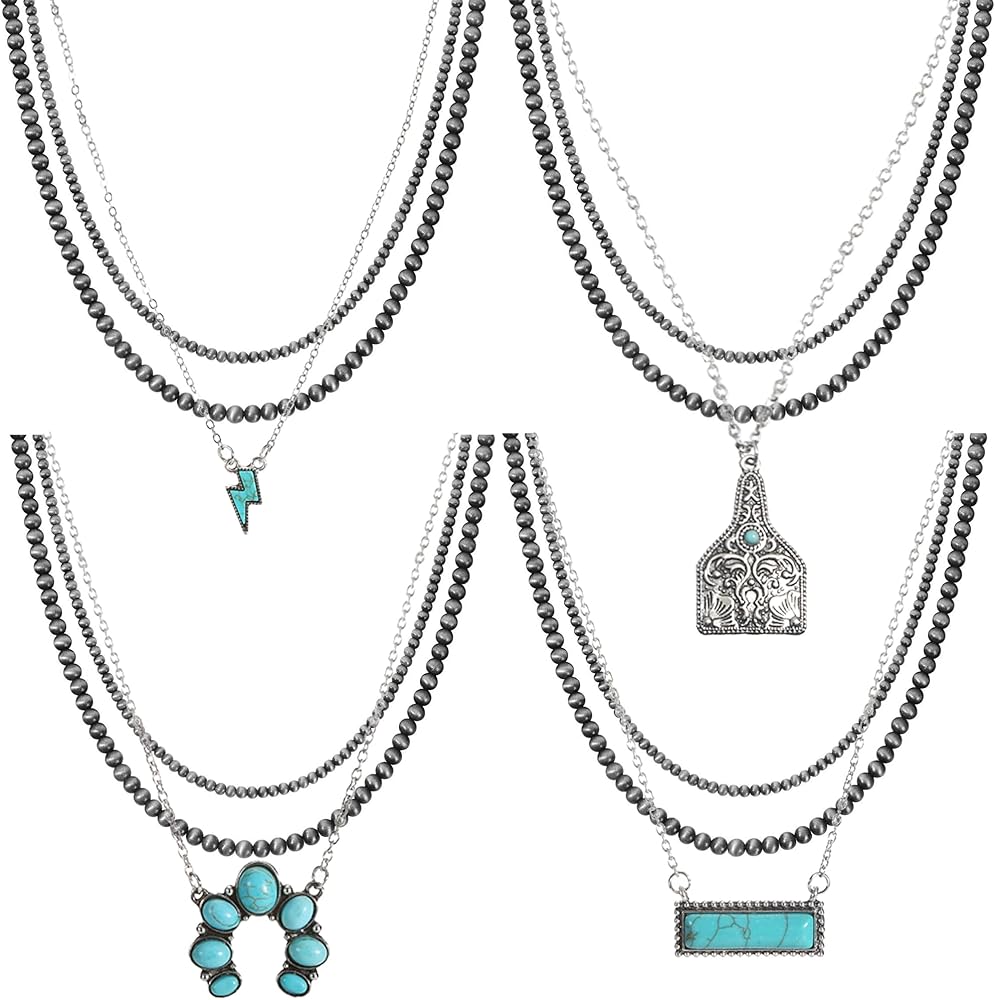 Navajo Pearl Turquoise Pendant Necklace--Packing including 4pcs layer navajo pearl thuquoise pendant necklace .The classic design of this Navajo pearl set fully reflects the characteristics of the Navajo Nation and perfectly combines the elements of the Western cowboy.