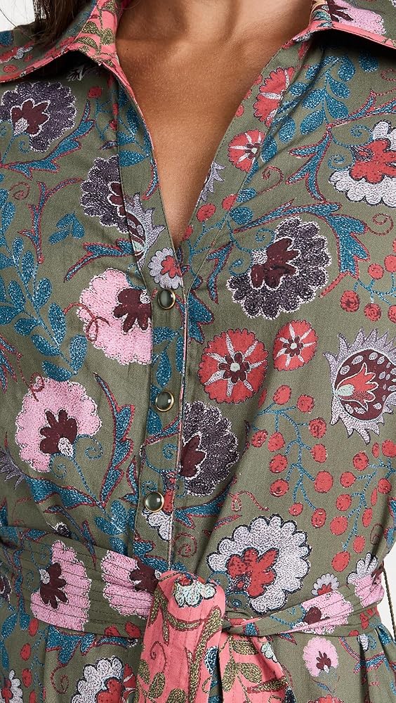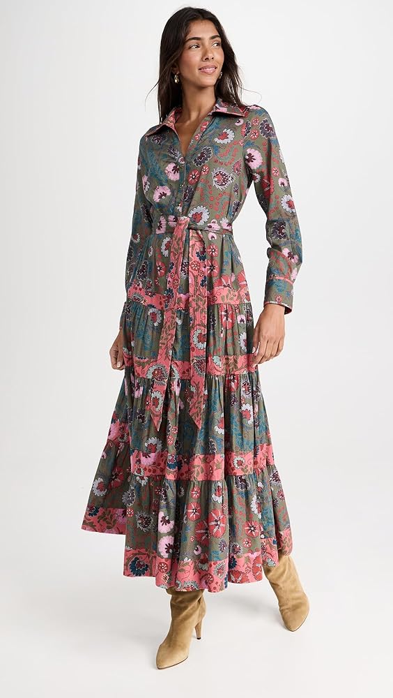 - Collared neckline and button placket, Long sleeves with button cuffs, Floral print, Tiered skirt