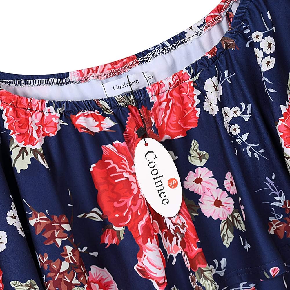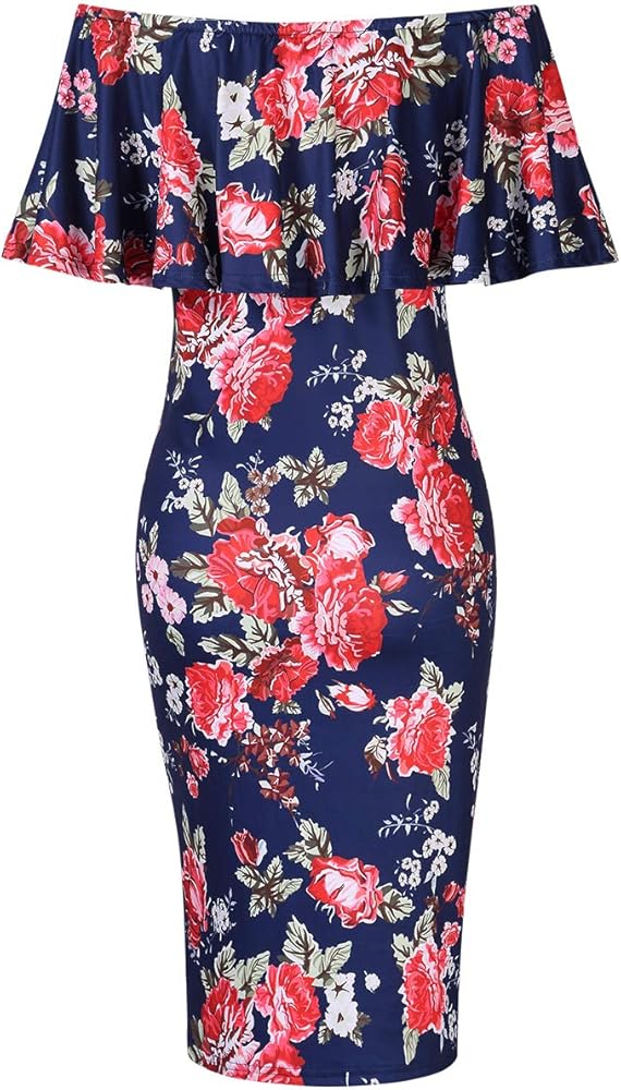 Women's Maternity Dress Off Shoulder Casual Maxi Dress (L,Navy printing2)