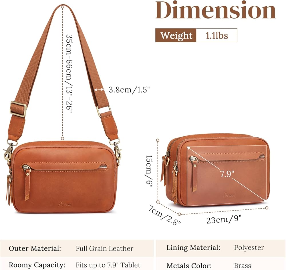 Perfect Size Leather Handbags: Dimension: 9”/23cm*2.7”/7cm*6”/15cm(L*W*H). Fits up to 7.9” Tablet. Net weight: 1.1 lbs/0.5kg. It's the perfect size and lightweight to carry, perfect for everyday use