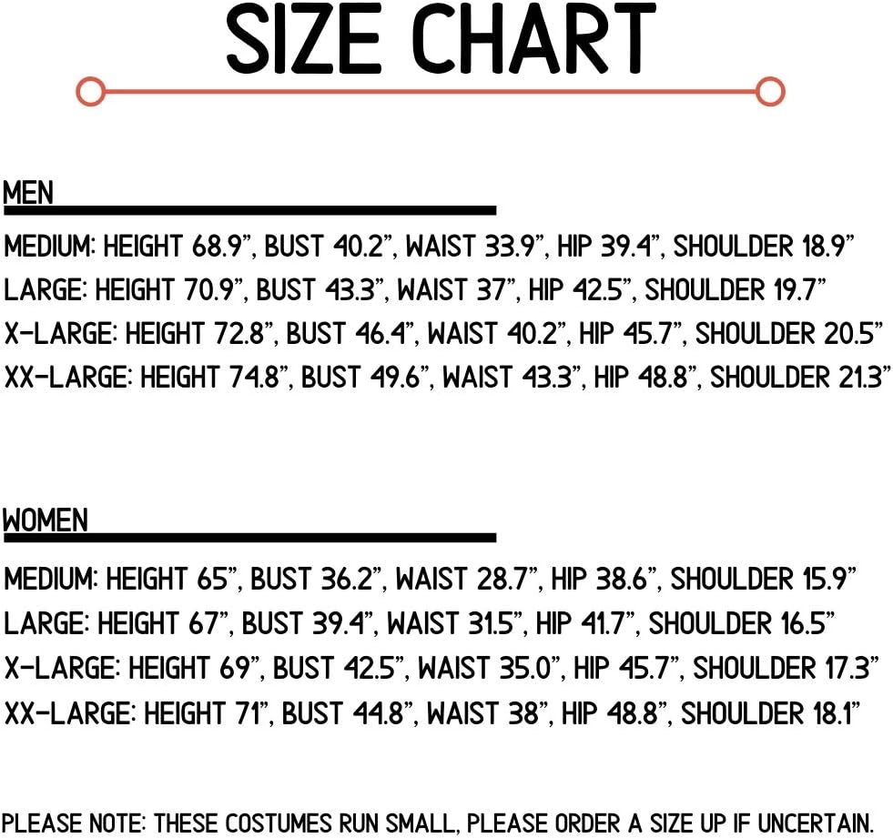 DIFFERENT SIZES AND CHARACTERS: Choose the right character and the right size for you! Available in multiple sizes. Kindly note that these costumes run SMALL, please order a 1 or 2 sizes up. Outfits for other characters available as well.