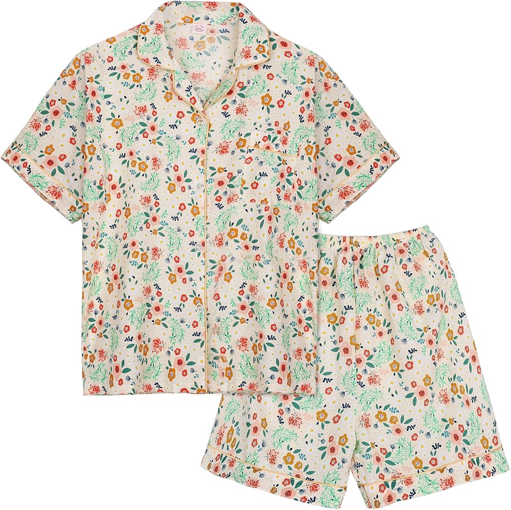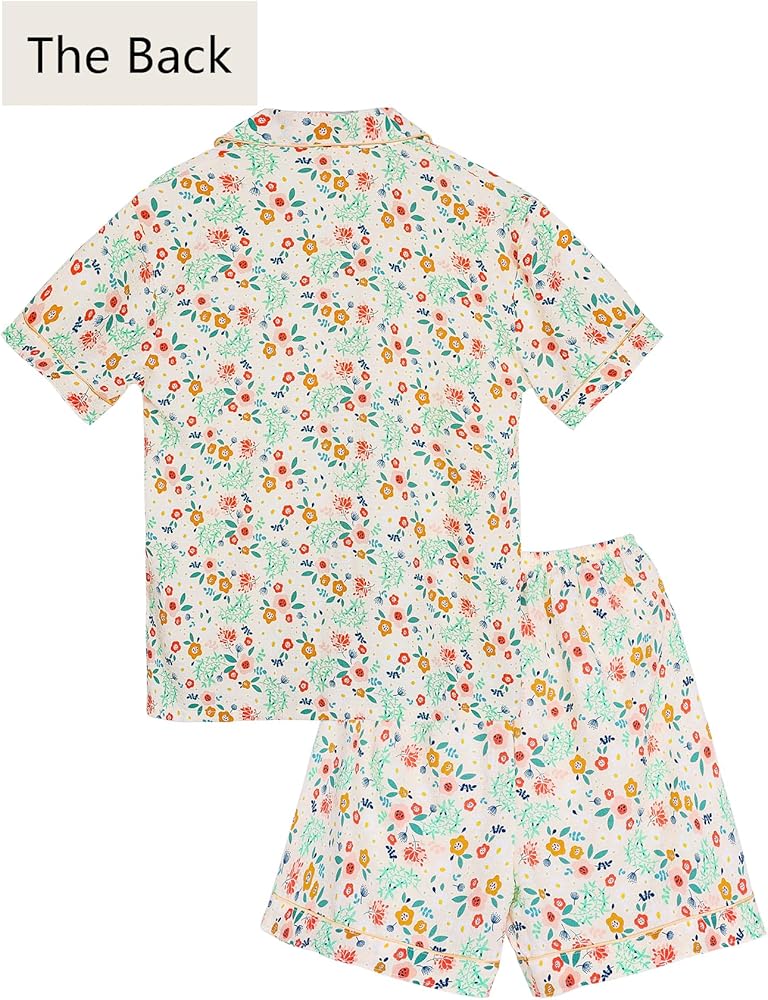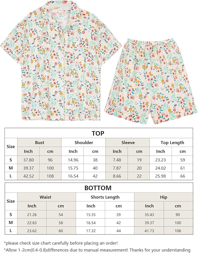 Features: Short sleeve shirts and shorts two piece pajama set, Elastic waistband, Funny patterns printed with floral, bunny, strawberry, Button Down and shirt collar design, lightweight and comfortable for loungewear and nightwear, super soft and breathable material are skin-friendly