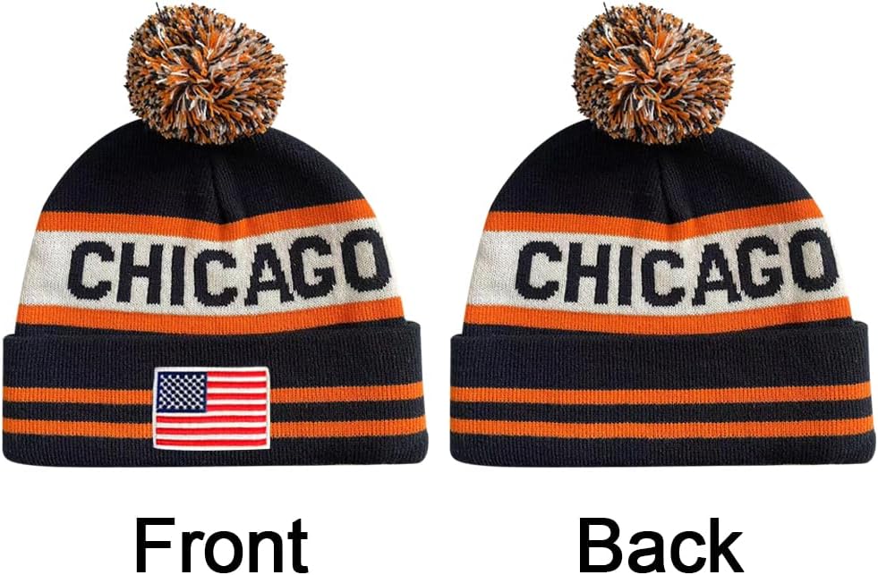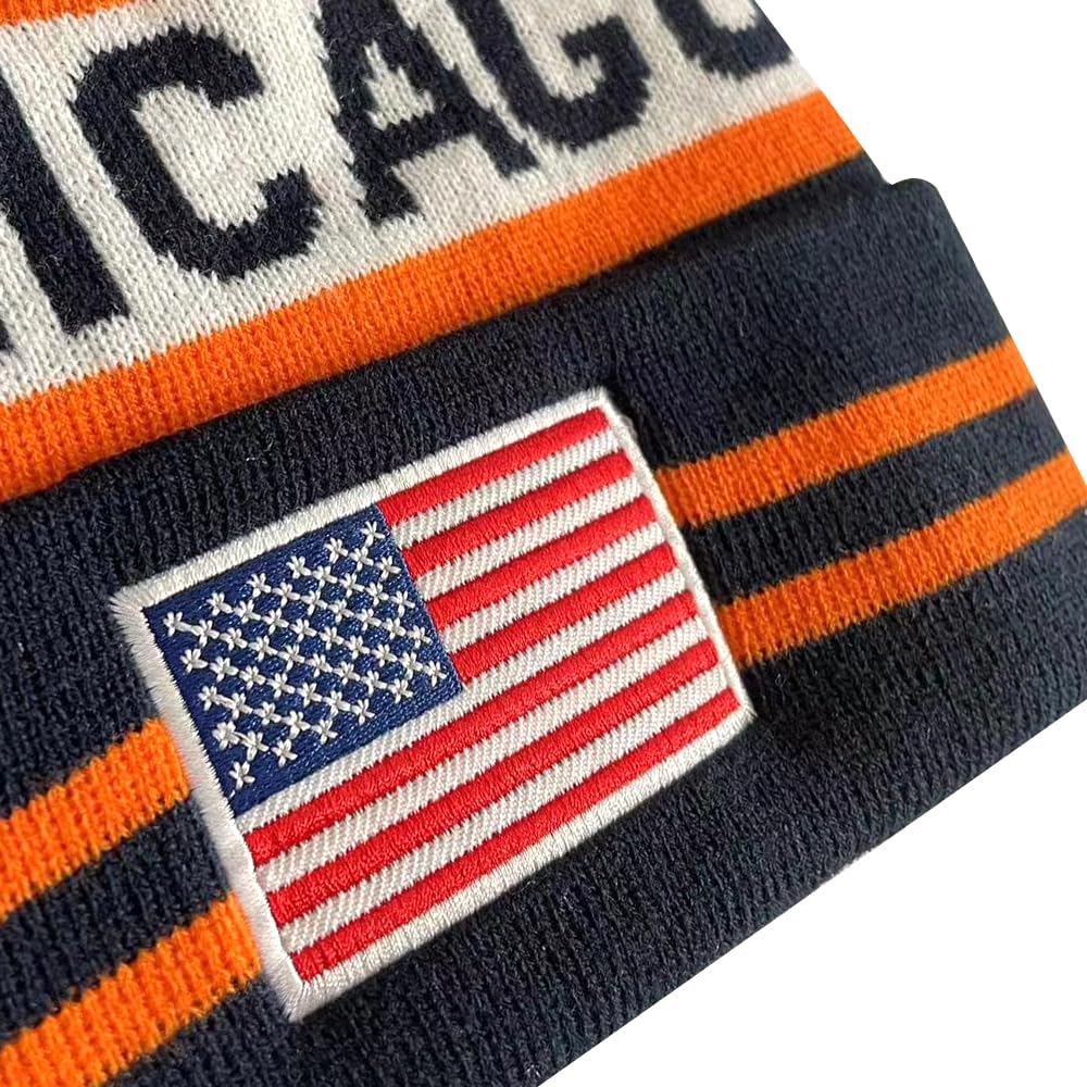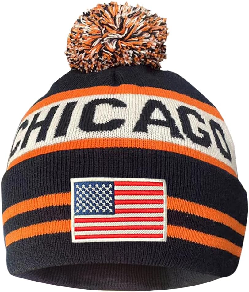 US Flag Chicago City Football Embroidery Classic Pom Cuff Chicago Beanie Hat Cuffed Winter Hat Knit Toque Skull Cap Navy Blue