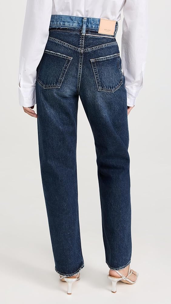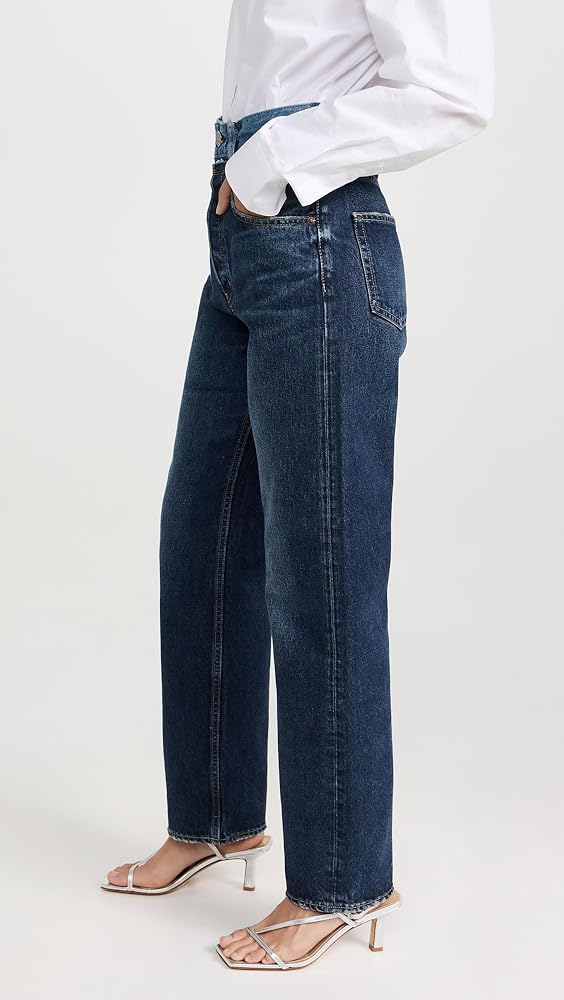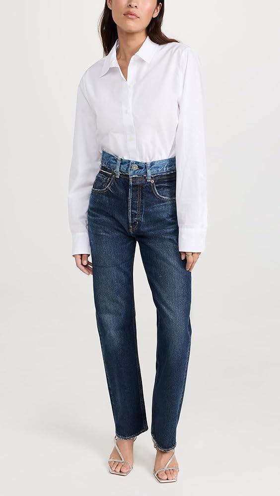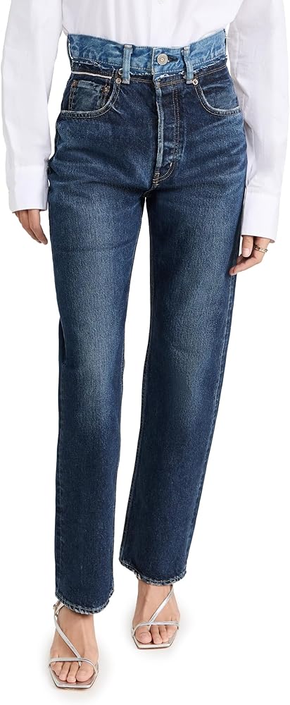 Runs true to size. , Designed with a super-high rise and straight leg. Fits slightly roomy in the waistband and may ride up in the back. Denim has no stretch and may feel snug initially, but will soften and give with regular wear.
