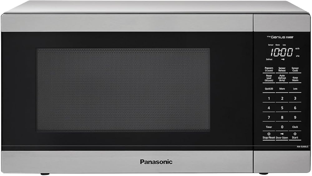 The Panasonic NN-SD67LS microwave with Genius Sensor technology features a sleek stainless steel design, with powerful defrosting, cooking and reheating capability, perfect for singles and families. It's compact, countertop design fits well in a house, apartment, or dorm. This exceptional 1100-watt, 1.3-Cubic-foot Capacity microwave with painted metal interior and 12.4-Inch turntable helps foods retain more color, texture and nutrients for fast, easy and delicious results. One-touch genius sensor cook and reheat functions, takes the guesswork out of microwaving by automatically setting power levels and adjusting cooking or reheating time. This microwave sits on your countertop with 10 Auto/Sensor Cook options including Potato, Fresh Vegetables, Frozen Vegetables, Frozen Pizza, Frozen Entrée, Casserole, Pasta, Rice, Stew and Fish Fillet. Quick controls include Quick 30, Popcorn and Keep Warm, plus Auto Defrost and Sensor Reheat. Child lock, kitchen timer and 3 stage cooking options. This countertop microwave oven measures 21.2” W x 11.8” H x 17.4” D and has a clear black glass screen. As a countertop microwave, the Panasonic NN-SD67LS can rest on any open surface in the kitchen and can be easily moved.