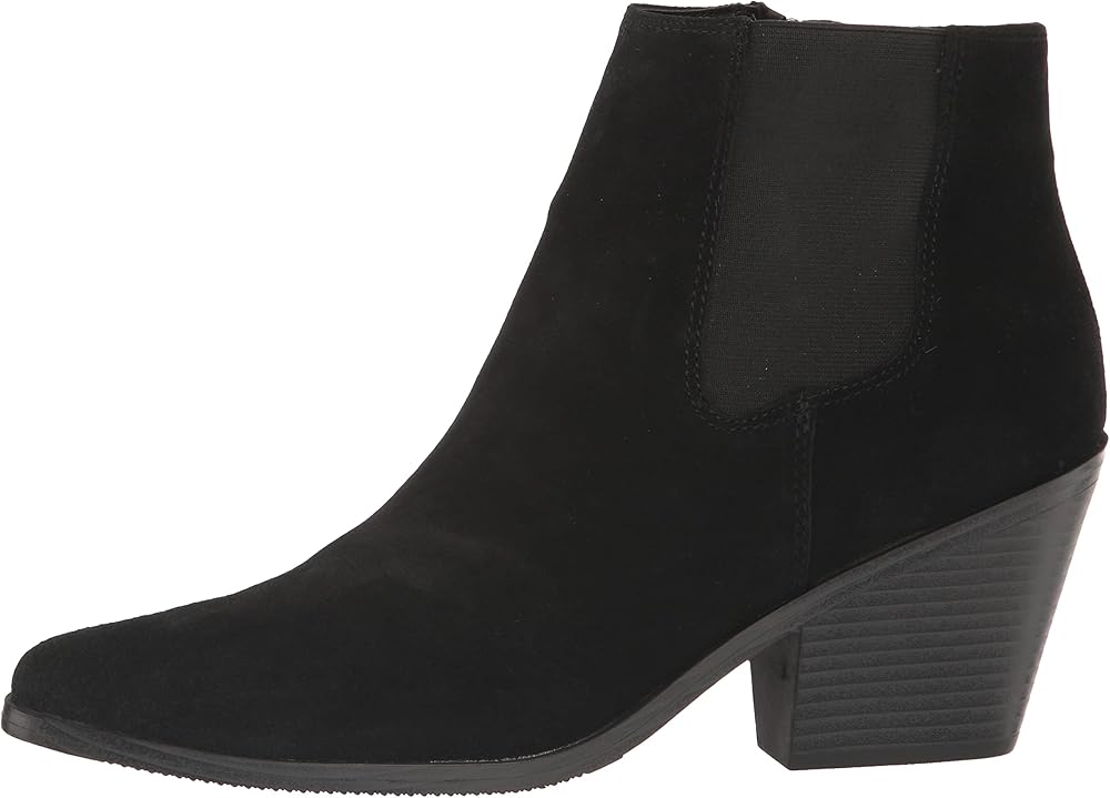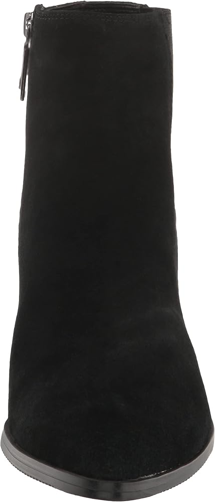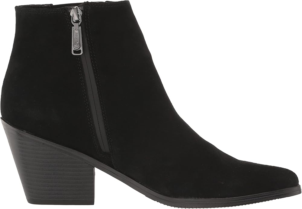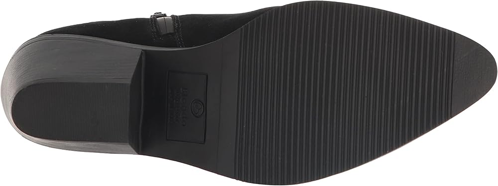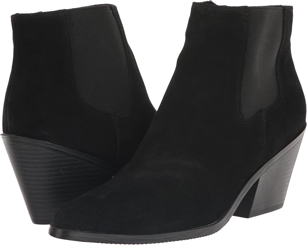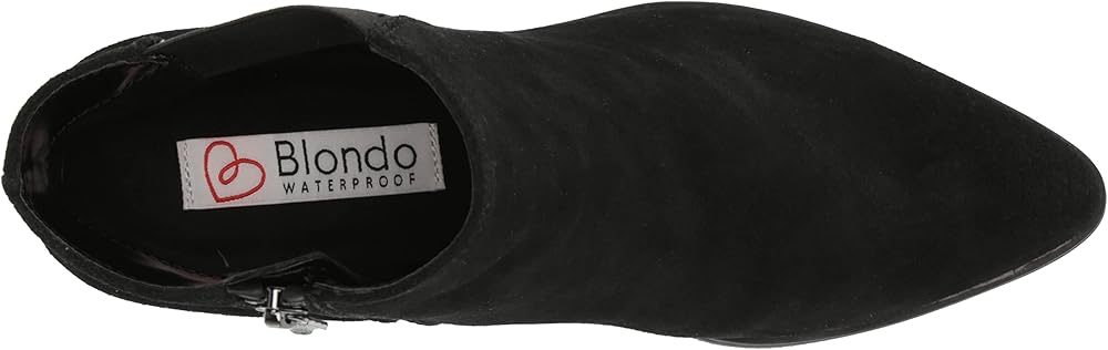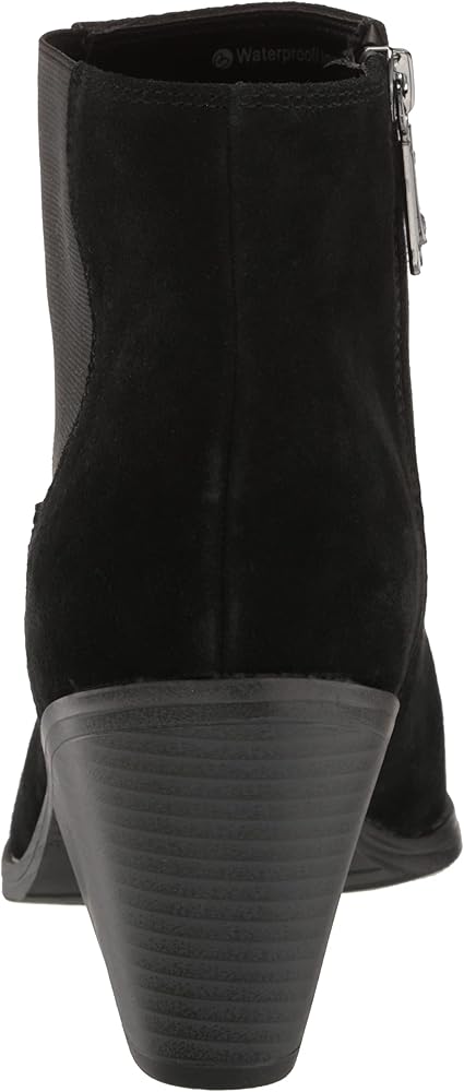 A suede bootie raised on a stacked heel provides all-weather protection with a waterproof finish.