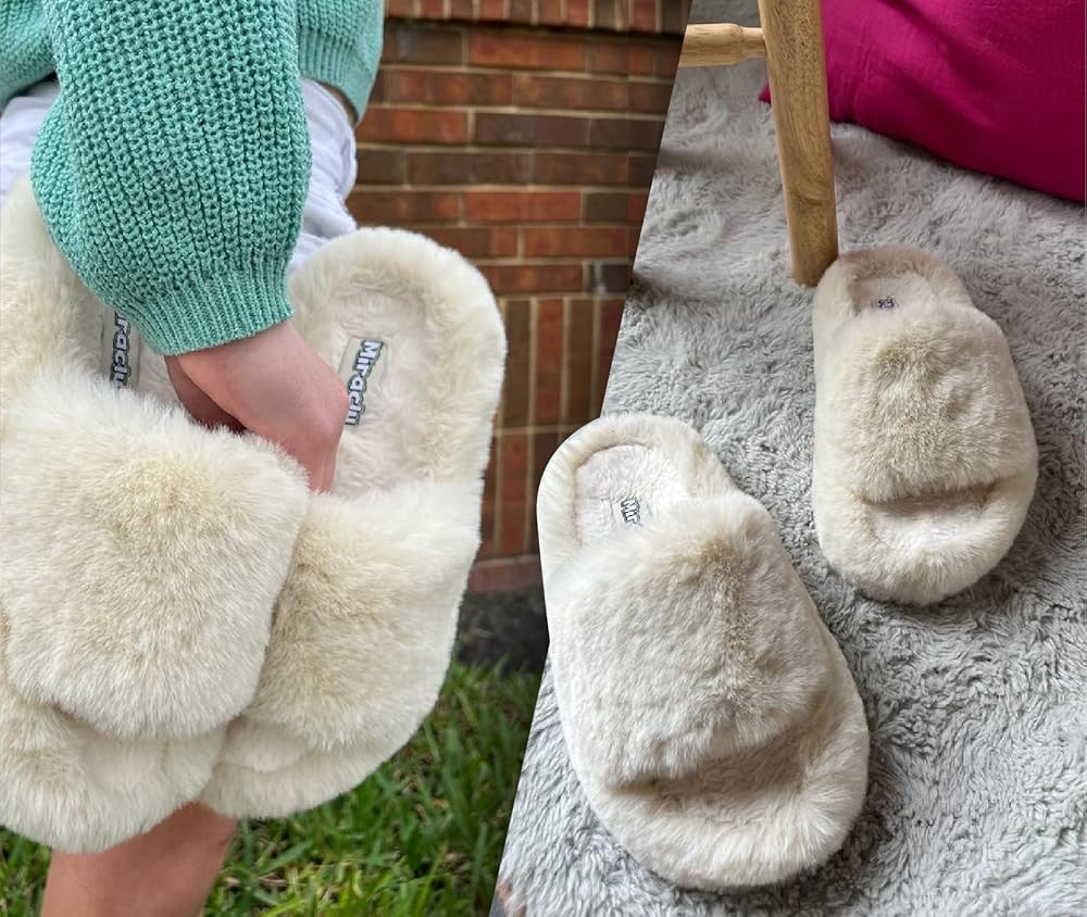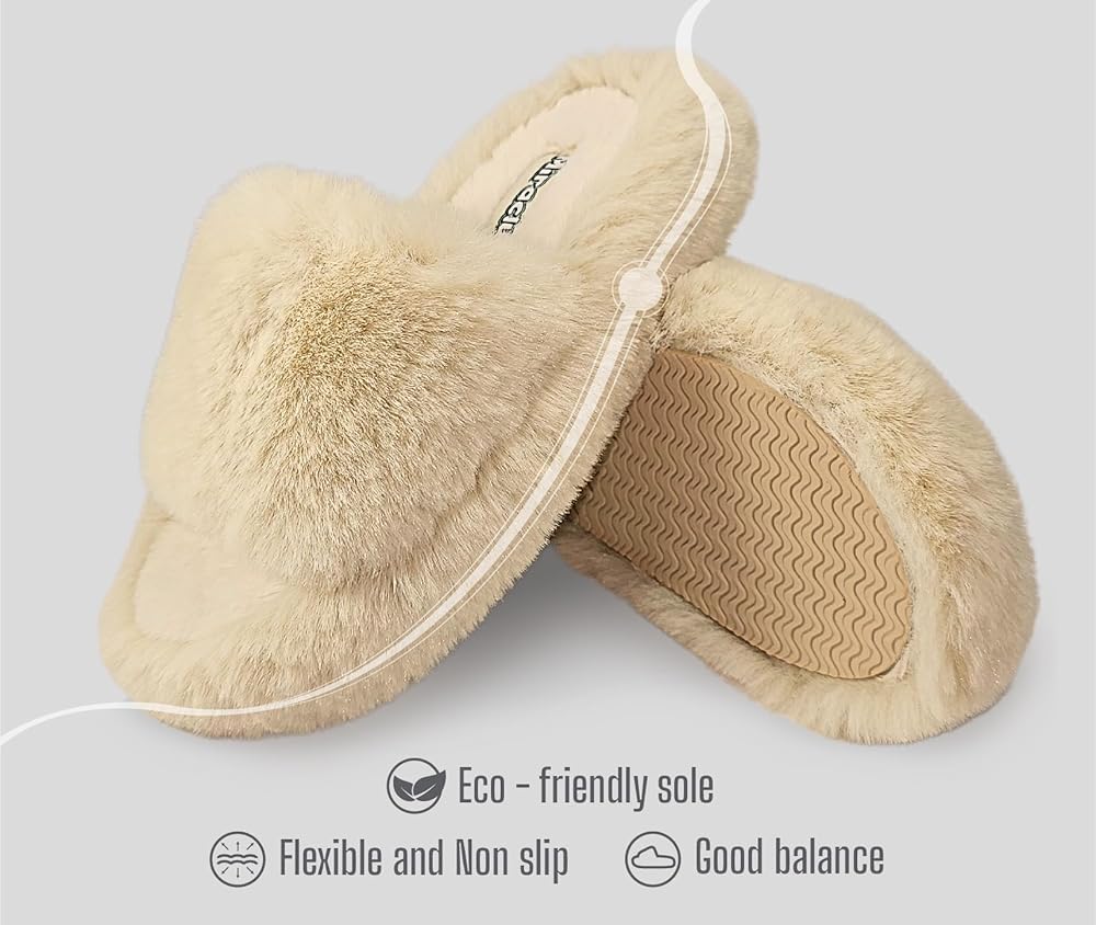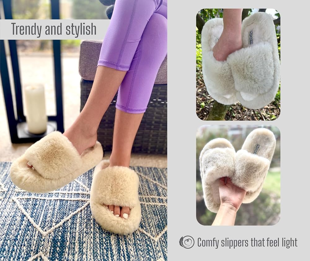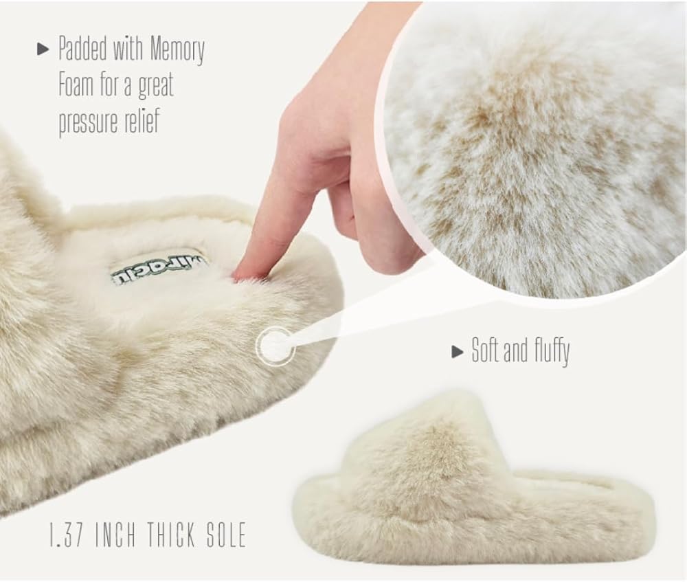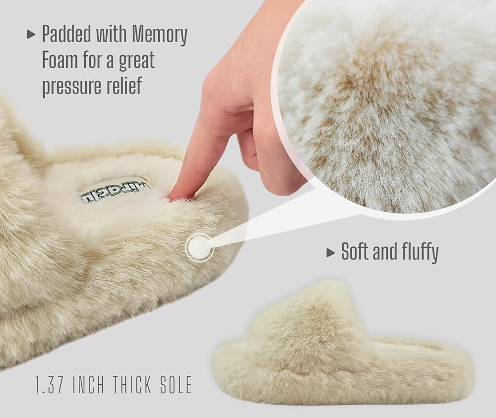 [COMFY and SUPPORTIVE]: Fuzzy slippers padded with Memory Foam, that provides great stability and excellent pressure relief. Slippers for women with faux fur upper and a cushioned platform sole