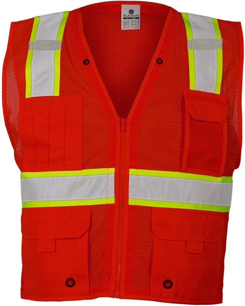 Our Enhanced Visibility Multi-Pocket Mesh Vest is specially designed to keep you in sight, on site. In a unique royal blue color that comes stitched with a 2" high-performance reflective silver stripe laminated onto 3" lime contrasting bands. This vest boasts 2 lower outside cargo pockets with adjustable flaps, a right chest 2-tier pencil pocket, a left chest radio pocket, and a clear ID pocket with flap. Also comes with 2 inside lower patch pockets, as well as mic tabs and lapel grommets. Wear a vest that works as hard as you do.