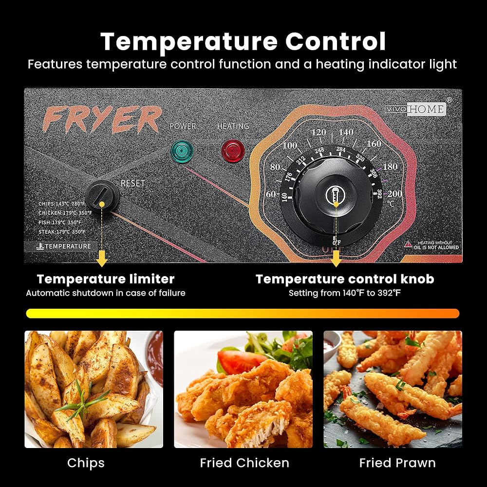 TEMPERATURE CONTROL - Features temperature control function and a heating indicator light; Temperature can be adjusted from 140℉ to 392℉ (60℃-200℃), you can set the optimal temperature depending on what you're cooking; This deep fryer will automatically shut off when the temperature is over 230℃ (446℉) or the temperature controller breaks down