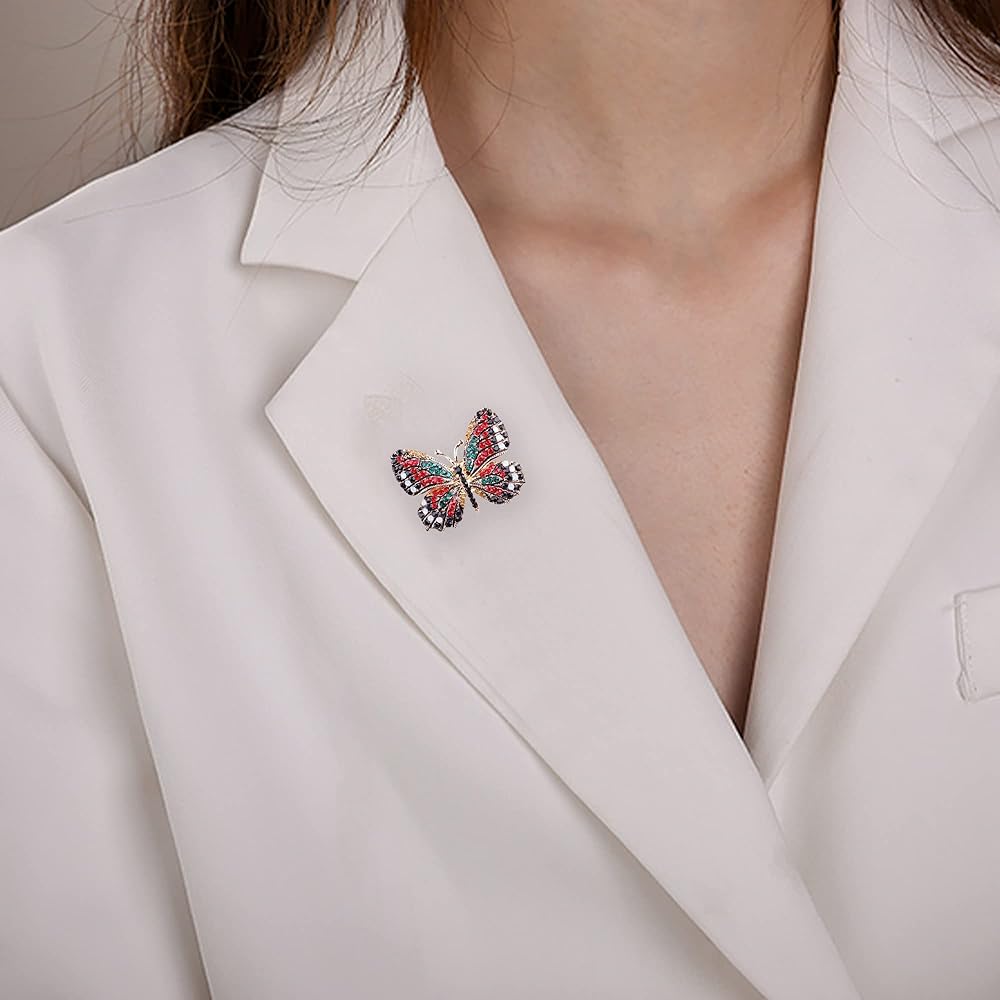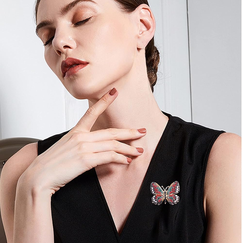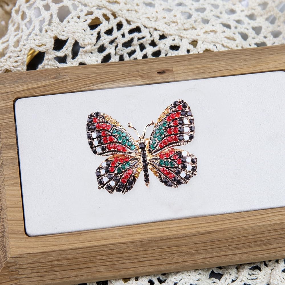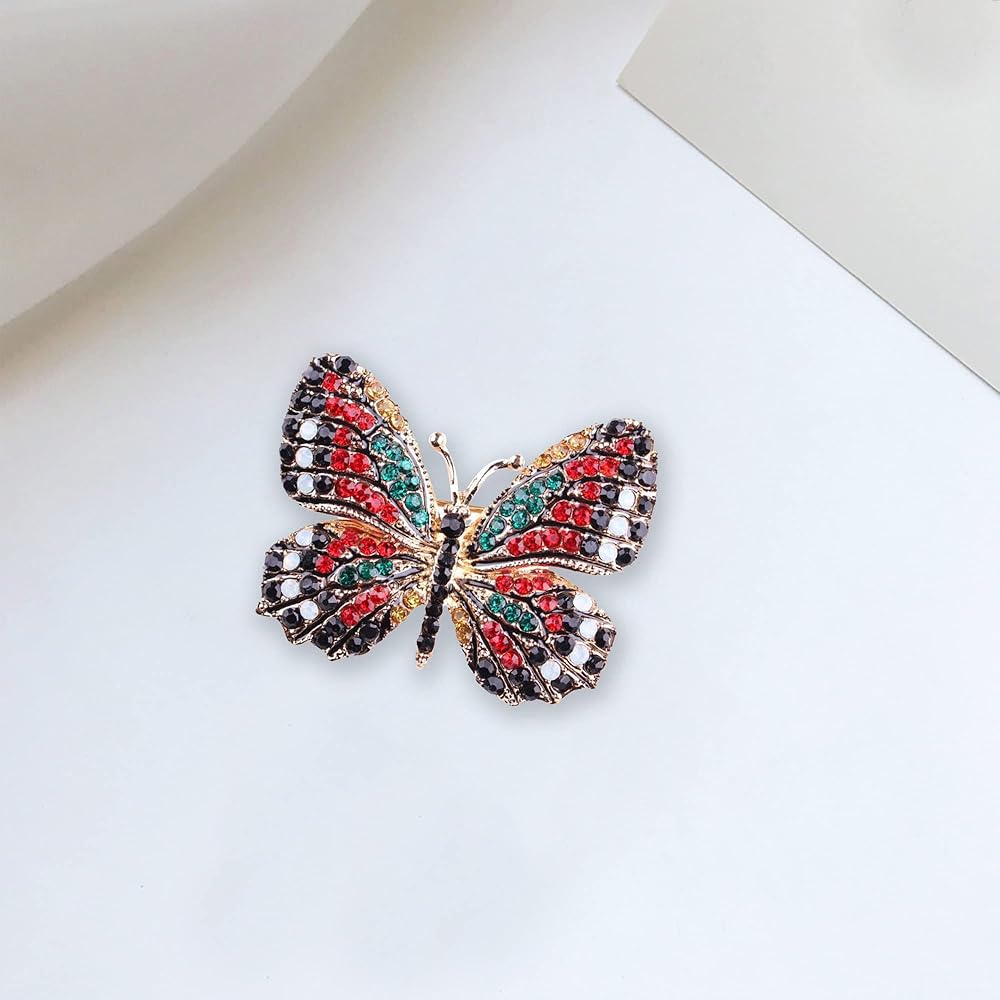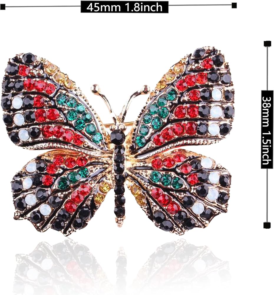 🦋THE STYLE— Our latest statement piece features this stylish fashionable pin butterfly design and with multicolored rhinestones that includes a black, white, skyblue and blue in gold tone finish.
