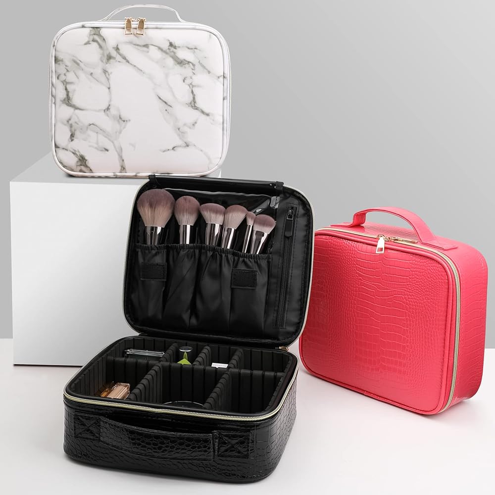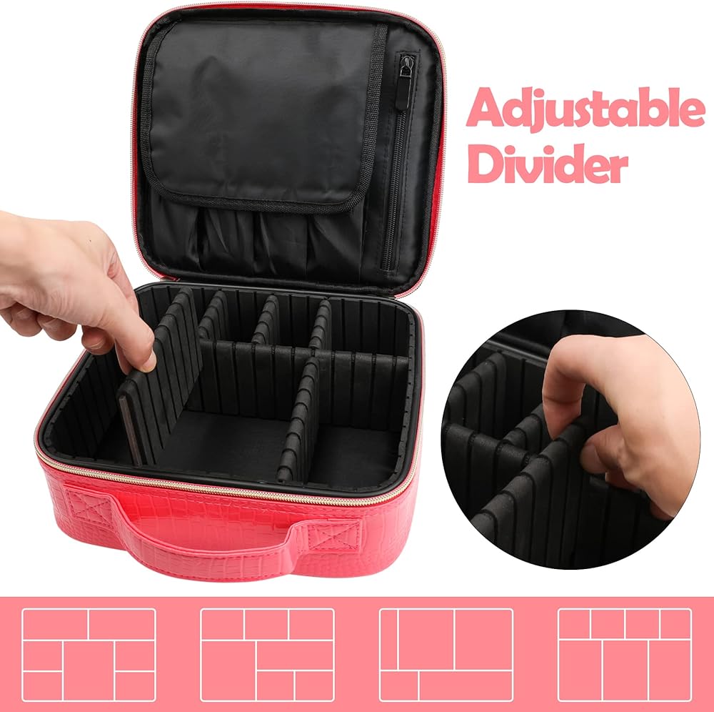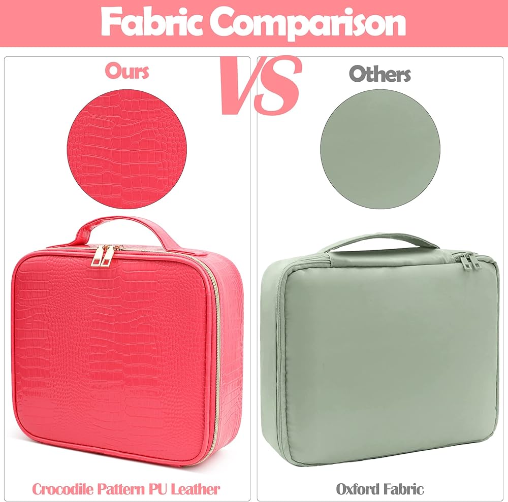 [High-Quality Crocodile PU Leather] - This 10" makeup bag is made of waterproof PU leather with unique crocodile pattern, durable oxford fabric and soft EVA padding dividers, elegant and shockproof. Strong and smooth double metal zippers keep your cosmetics safe